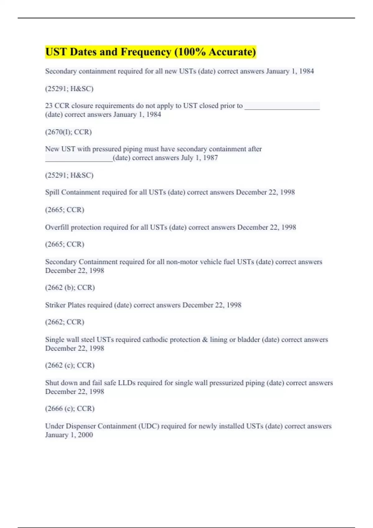 Secondary containment required for all new USTs (date) correct answers January 1, 1984 (25291; H&SC) 23 CCR closure requirements do not apply to UST closed prior to ____________________ (date) correct answers January 1, 1984 (2670(I); CCR) New UST with pressured piping must have secondary containment after __________________(date) correct answers July 1, 1987 (25291; H&SC) Spill Containment required for all USTs (date) correct answers December 22, 1998 (2665; CCR) Overfill protection required for all USTs (date) correct answers December 22, 1998 (2665; CCR) Secondary Containment required for all non-motor vehicle fuel USTs (date) correct answers December 22, 1998 (2662 (b); CCR) Striker Plates required (date) correct answers December 22, 1998 (2662; CCR) Single wall steel USTs required cathodic protection & lining or bladder (date) correct answers December 22, 1998 (2662 (c); CCR) Shut down and fail safe LLDs required for single wall pressurized piping (date) correct answers December 22, 1998 (2666 (c); CCR) Under Dispenser Containment (UDC) required for newly installed USTs (date) correct answers January 1, 2000