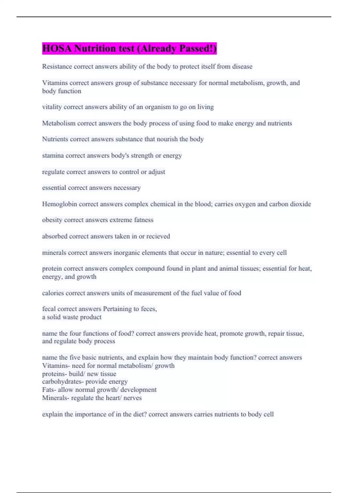 Resistance correct answers ability of the body to protect itself from disease Vitamins correct answers group of substance necessary for normal metabolism, growth, and body function vitality correct answers ability of an organism to go on living Metabolism correct answers the body process of using food to make energy and nutrients Nutrients correct answers substance that nourish the body stamina correct answers body's strength or energy regulate correct answers to control or adjust essential correct answers necessary Hemoglobin correct answers complex chemical in the blood; carries oxygen and carbon dioxide obesity correct answers extreme fatness absorbed correct answers taken in or recieved minerals correct answers inorganic elements that occur in nature; essential to every cell protein correct answers complex compound found in plant and animal tissues; essential for heat, energy, and growth calories correct answers units of measurement of the fuel value of food fecal correct answers Pertaining to feces, a solid waste product name the four functions of food? correct answers provide heat, promote growth, repair tissue, and regulate body process name the five basic nutrients, and explain how they maintain body function? correct answers Vitamins- need for normal metabolism/ growth proteins- build/ new tissue carbohydrates- provide energy Fats- allow normal growth/ development Minerals- regulate the heart/ nerves explain the importance of in the diet? correct answers carries nutrients to body cell