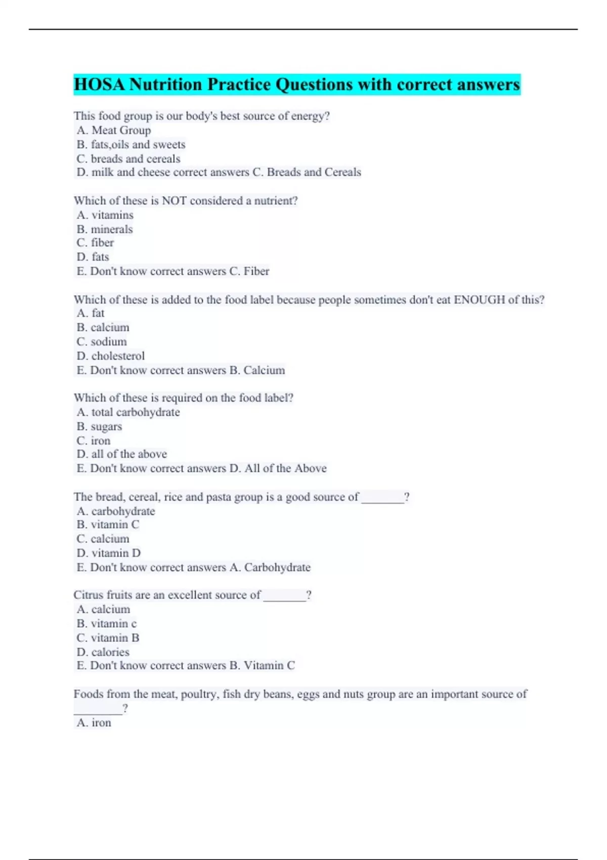This food group is our body's best source of energy? A. Meat Group B. fats,oils and sweets C. breads and cereals D. milk and cheese correct answers C. Breads and Cereals Which of these is NOT considered a nutrient? A. vitamins B. minerals C. fiber D. fats E. Don't know correct answers C. Fiber Which of these is added to the food label because people sometimes don't eat ENOUGH of this? A. fat B. calcium C. sodium D. cholesterol E. Don't know correct answers B. Calcium Which of these is required on the food label? A. total carbohydrate B. sugars C. iron D. all of the above E. Don't know correct answers D. All of the Above The bread, cereal, rice and pasta group is a good source of _______? A. carbohydrate B. vitamin C C. calcium D. vitamin D E. Don't know correct answers A. Carbohydrate Citrus fruits are an excellent source of _______? A. calcium B. vitamin c C. vitamin B D. calories E. Don't know correct answers B. Vitamin C Foods from the meat, poultry, fish dry beans, eggs and nuts group are an important source of ________? A. iron