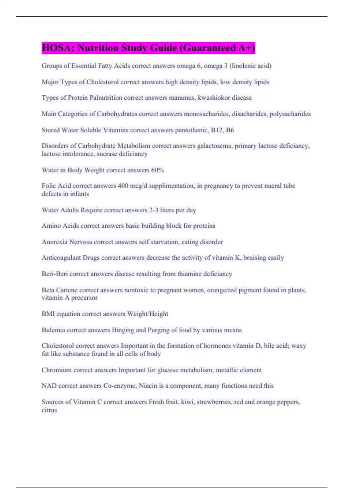 HOSA: Nutrition Study Guide (Guaranteed A+)