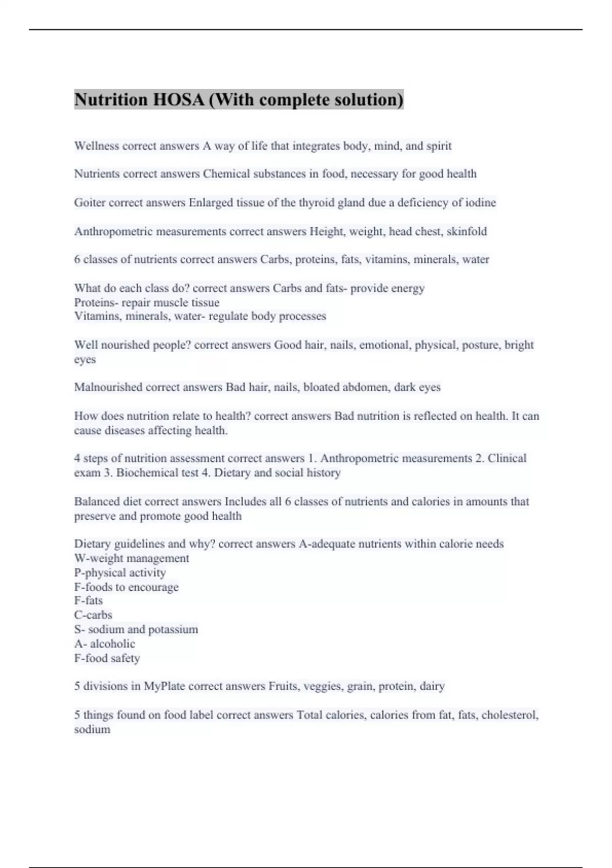 Wellness correct answers A way of life that integrates body, mind, and spirit Nutrients correct answers Chemical substances in food, necessary for good health Goiter correct answers Enlarged tissue of the thyroid gland due a deficiency of iodine Anthropometric measurements correct answers Height, weight, head chest, skinfold 6 classes of nutrients correct answers Carbs, proteins, fats, vitamins, minerals, water What do each class do? correct answers Carbs and fats- provide energy Proteins- repair muscle tissue Vitamins, minerals, water- regulate body processes Well nourished people? correct answers Good hair, nails, emotional, physical, posture, bright eyes Malnourished correct answers Bad hair, nails, bloated abdomen, dark eyes How does nutrition relate to health? correct answers Bad nutrition is reflected on health. It can cause diseases affecting health. 4 steps of nutrition assessment correct answers 1. Anthropometric measurements 2. Clinical exam 3. Biochemical test 4. Dietary and social history Balanced diet correct answers Includes all 6 classes of nutrients and calories in amounts that preserve and promote good health Dietary guidelines and why? correct answers A-adequate nutrients within calorie needs W-weight management P-physical activity F-foods to encourage F-fats C-carbs S- sodium and potassium A- alcoholic F-food safety 5 divisions in MyPlate correct answers Fruits, veggies, grain, protein, dairy 5 things found on food label correct answers Total calories, calories from fat, fats, cholesterol, sodium