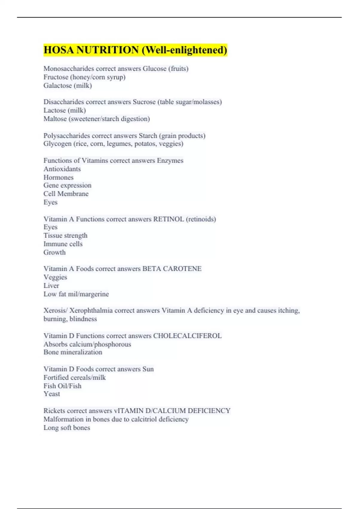 Monosaccharides correct answers Glucose (fruits) Fructose (honey/corn syrup) Galactose (milk) Disaccharides correct answers Sucrose (table sugar/molasses) Lactose (milk) Maltose (sweetener/starch digestion) Polysaccharides correct answers Starch (grain products) Glycogen (rice, corn, legumes, potatos, veggies) Functions of Vitamins correct answers Enzymes Antioxidants Hormones Gene expression Cell Membrane Eyes Vitamin A Functions correct answers RETINOL (retinoids) Eyes Tissue strength Immune cells Growth Vitamin A Foods correct answers BETA CAROTENE Veggies Liver Low fat mil/margerine Xerosis/ Xerophthalmia correct answers Vitamin A deficiency in eye and causes itching, burning, blindness Vitamin D Functions correct answers CHOLECALCIFEROL Absorbs calcium/phosphorous Bone mineralization Vitamin D Foods correct answers Sun Fortified cereals/milk Fish Oil/Fish Yeast Rickets correct answers vITAMIN D/CALCIUM DEFICIENCY Malformation in bones due to calcitriol deficiency Long soft bones