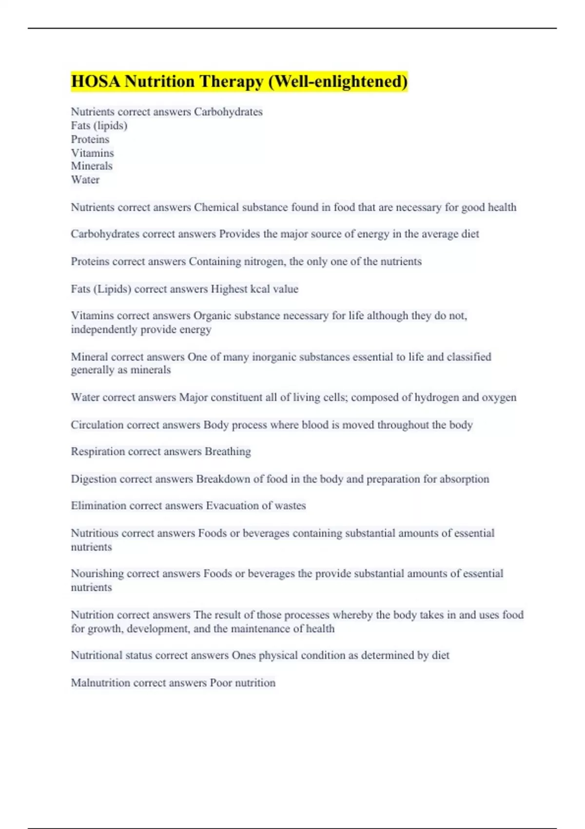 Nutrients correct answers Carbohydrates Fats (lipids) Proteins Vitamins Minerals Water Nutrients correct answers Chemical substance found in food that are necessary for good health Carbohydrates correct answers Provides the major source of energy in the average diet Proteins correct answers Containing nitrogen, the only one of the nutrients Fats (Lipids) correct answers Highest kcal value Vitamins correct answers Organic substance necessary for life although they do not, independently provide energy Mineral correct answers One of many inorganic substances essential to life and classified generally as minerals Water correct answers Major constituent all of living cells; composed of hydrogen and oxygen Circulation correct answers Body process where blood is moved throughout the body Respiration correct answers Breathing Digestion correct answers Breakdown of food in the body and preparation for absorption Elimination correct answers Evacuation of wastes Nutritious correct answers Foods or beverages containing substantial amounts of essential nutrients Nourishing correct answers Foods or beverages the provide substantial amounts of essential nutrients Nutrition correct answers The result of those processes whereby the body takes in and uses food for growth, development, and the maintenance of health Nutritional status correct answers Ones physical condition as determined by diet Malnutrition correct answers Poor nutrition