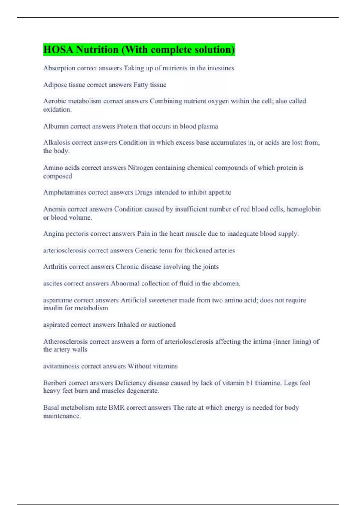 Absorption correct answers Taking up of nutrients in the intestines Adipose tissue correct answers Fatty tissue Aerobic metabolism correct answers Combining nutrient oxygen within the cell; also called oxidation. Albumin correct answers Protein that occurs in blood plasma Alkalosis correct answers Condition in which excess base accumulates in, or acids are lost from, the body. Amino acids correct answers Nitrogen containing chemical compounds of which protein is composed Amphetamines correct answers Drugs intended to inhibit appetite Anemia correct answers Condition caused by insufficient number of red blood cells, hemoglobin or blood volume. Angina pectoris correct answers Pain in the heart muscle due to inadequate blood supply. arteriosclerosis correct answers Generic term for thickened arteries Arthritis correct answers Chronic disease involving the joints ascites correct answers Abnormal collection of fluid in the abdomen. aspartame correct answers Artificial sweetener made from two amino acid; does not require insulin for metabolism aspirated correct answers Inhaled or suctioned Atherosclerosis correct answers a form of arteriolosclerosis affecting the intima (inner lining) of the artery walls avitaminosis correct answers Without vitamins Beriberi correct answers Deficiency disease caused by lack of vitamin b1 thiamine. Legs feel heavy feet burn and muscles degenerate. Basal metabolism rate BMR correct answers The rate at which energy is needed for body maintenance.