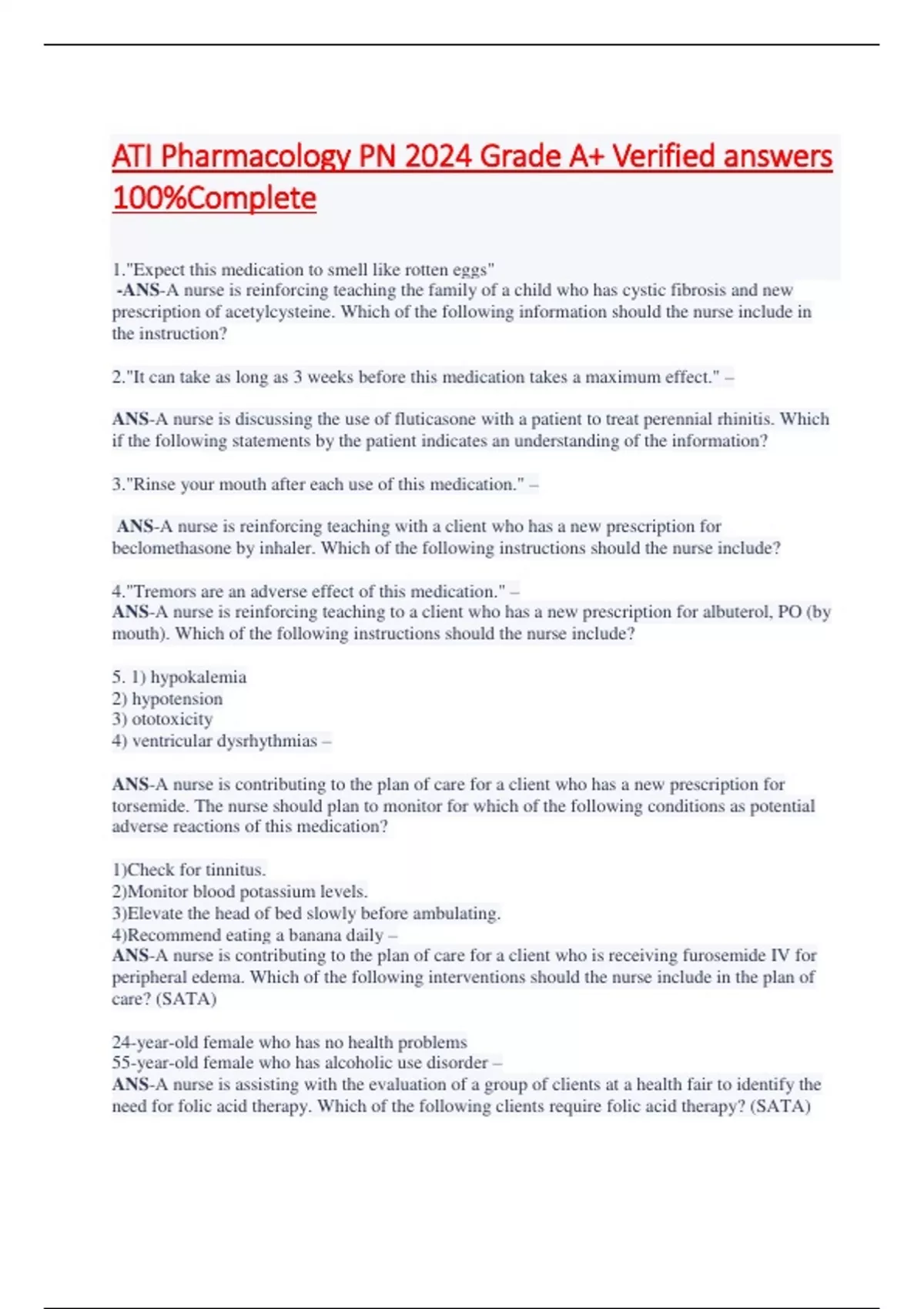 ATI Pharmacology PN 2024 Grade A+ Verified answers 100%Complete 1."Expect this medication to smell like rotten eggs" -ANS-A nurse is reinforcing teaching the family of a child who has cystic fibrosis and new prescription of acetylcysteine. Which of the following information should the nurse include in the instruction? 2."It can take as long as 3 weeks before this medication takes a maximum effect." – ANS-A nurse is discussing the use of fluticasone with a patient to treat perennial rhinitis. Which if the following statements by the patient indicates an understanding of the information? 3."Rinse your mouth after each use of this medication." – ANS-A nurse is reinforcing teaching with a client who has a new prescription for beclomethasone by inhaler. Which of the following instructions should the nurse include? 4."Tremors are an adverse effect of this medication." – ANS-A nurse is reinforcing teaching to a client who has a new prescription for albuterol, PO (by mouth). Which of the following instructions should the nurse include? 5. 1) hypokalemia 2) hypotension 3) ototoxicity 4) ventricular dysrhythmias – ANS-A nurse is contributing to the plan of care for a client who has a new prescription for torsemide. The nurse should plan to monitor for which of the following conditions as potential adverse reactions of this medication? 1)Check for tinnitus. 2)Monitor blood potassium levels.