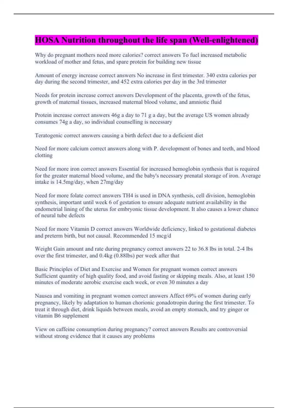 Why do pregnant mothers need more calories? correct answers To fuel increased metabolic workload of mother and fetus, and spare protein for building new tissue Amount of energy increase correct answers No increase in first trimester. 340 extra calories per day during the second trimester, and 452 extra calories per day in the 3rd trimester Needs for protein increase correct answers Development of the placenta, growth of the fetus, growth of maternal tissues, increased maternal blood volume, and amniotic fluid Protein increase correct answers 46g a day to 71 g a day, but the average US women already consumes 74g a day, so individual counselling is necessary Teratogenic correct answers causing a birth defect due to a deficient diet Need for more calcium correct answers along with P. development of bones and teeth, and blood clotting Need for more iron correct answers Essential for increased hemoglobin synthesis that is required for the greater maternal blood volume, and the baby's necessary prenatal storage of iron. Average intake is 14.5mg/day, when 27mg/day Need for more folate correct answers TH4 is used in DNA synthesis, cell division, hemoglobin synthesis, important until week 6 of gestation to ensure adequate nutrient availability in the endometrial lining of the uterus for embryonic tissue development. It also causes a lower chance of neural tube defects Need for more Vitamin D correct answers Worldwide deficiency, linked to gestational diabetes and preterm birth, but not causal. Recommended 15 mcg/d Weight Gain amount and rate during pregnancy correct answers 22 to 36.8 lbs in total. 2-4 lbs over the first trimester, and 0.4kg (0.88lbs) per week after that Basic Principles of Diet and Exercise and Women for pregnant women correct answers Sufficient quantity of high quality food, and avoid fasting or skipping meals. Also, at least 150 minutes of moderate aerobic exercise each week, or even 30 minutes a day Nausea and vomiting in pregnant women correct answers Affect 69% of women during early pregnancy, likely by adaptation to human chorionic gonadotropin during the first trimester. To treat it through diet, drink liquids between meals, avoid an empty stomach, and try ginger or vitamin B6 supplement View on caffeine consumption during pregnancy? correct answers Results are controversial without strong evidence that it causes any problems