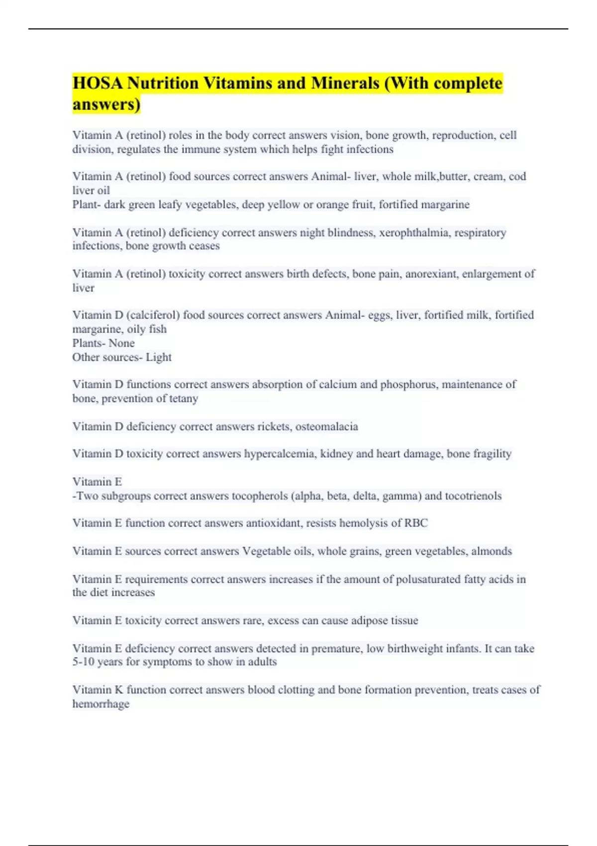 HOSA Nutrition Vitamins and Minerals (With complete answers)