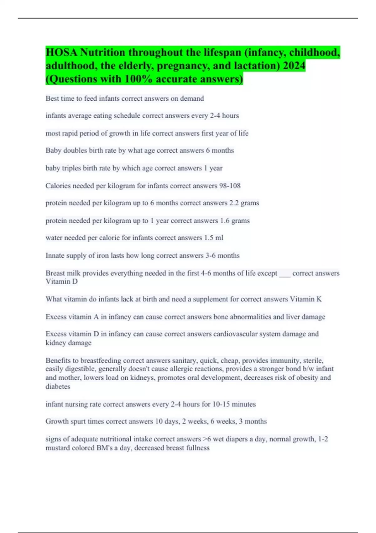 HOSA Nutrition throughout the lifespan (infancy, childhood, adulthood, the elderly, pregnancy, and lactation) 2024 (Questions with 100% accurate answers)