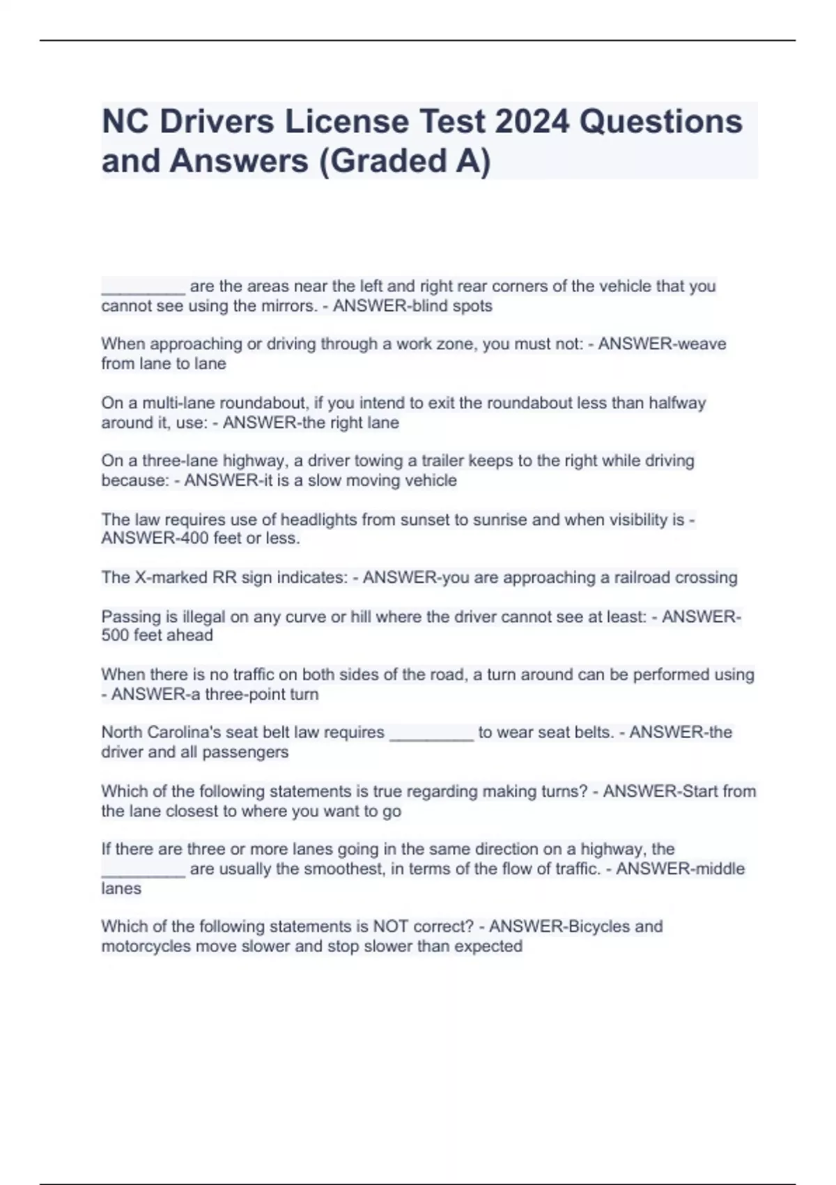 NC Drivers License Test 2024 Questions and Answers (Graded A) NC Drivers License Test 2024 Questions and Answers (Graded A) NC Drivers License Test 2024 Questions and Answers (Graded A) NC Drivers License Test 2024 Questions and Answers (Graded A) _________ are the areas near the left and right rear corners of the vehicle that you cannot see using the mirrors. - ANSWER-blind spots When approaching or driving through a work zone, you must not: - ANSWER-weave from lane to lane On a multi-lane roundabout, if you intend to exit the roundabout less than halfway around it, use: - ANSWER-the right lane On a three-lane highway, a driver towing a trailer keeps to the right while driving because: - ANSWER-it is a slow moving vehicle The law requires use of headlights from sunset to sunrise and when visibility is - ANSWER-400 feet or less. The X-marked RR sign indicates: - ANSWER-you are approaching a railroad crossing Passing is illegal on any curve or hill where the driver cannot see at least: - ANSWER-500 feet ahead When there is no traffic on both sides of the road, a turn around can be performed using - ANSWER-a three-point turn
