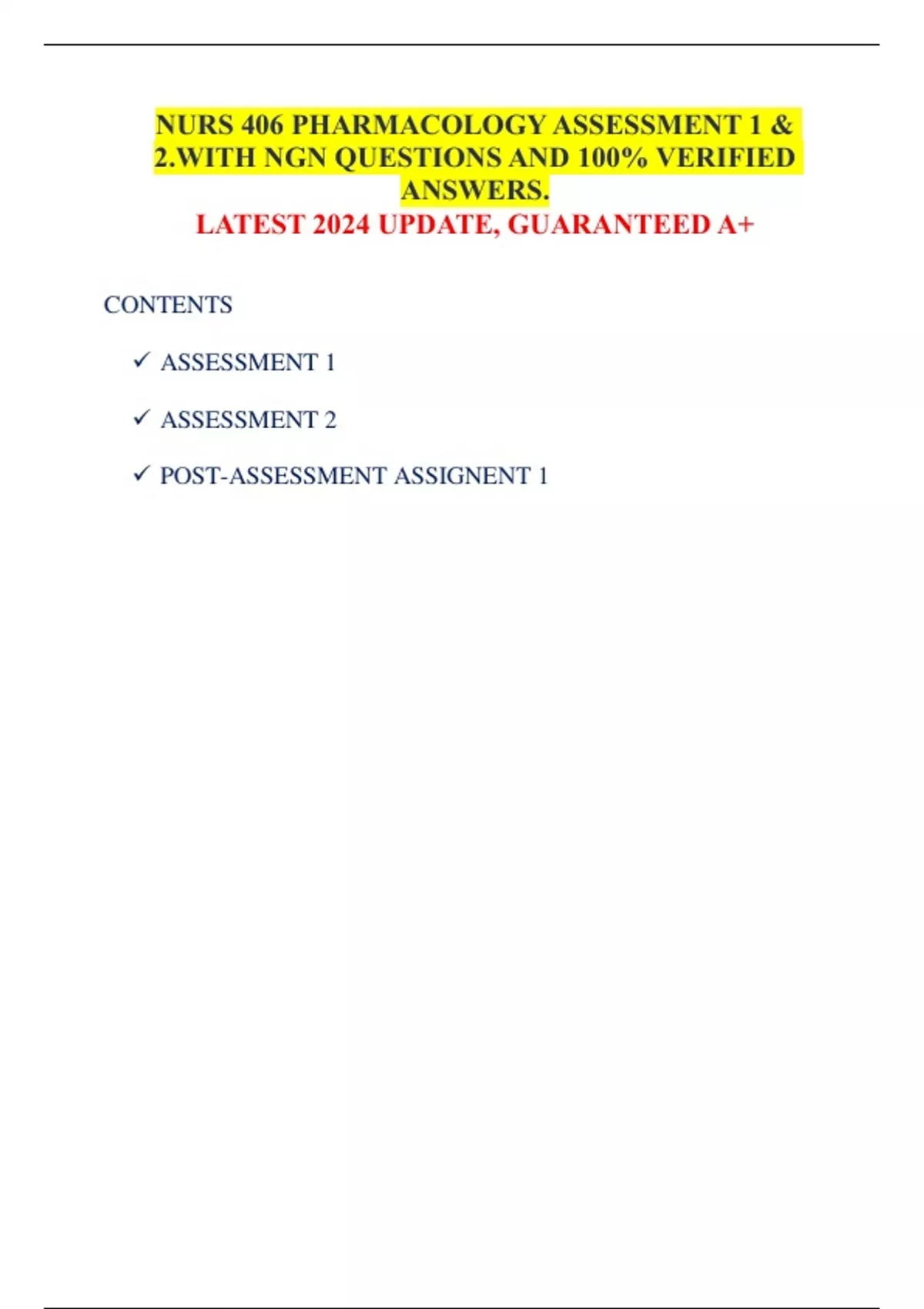NURS 406 PHARMACOLOGY ASSESSMENT 1 & 2.WITH NGN QUESTIONS AND 100% VERIFIED ANSWERS. LATEST 2024 UPDATE, GUARANTEED A+