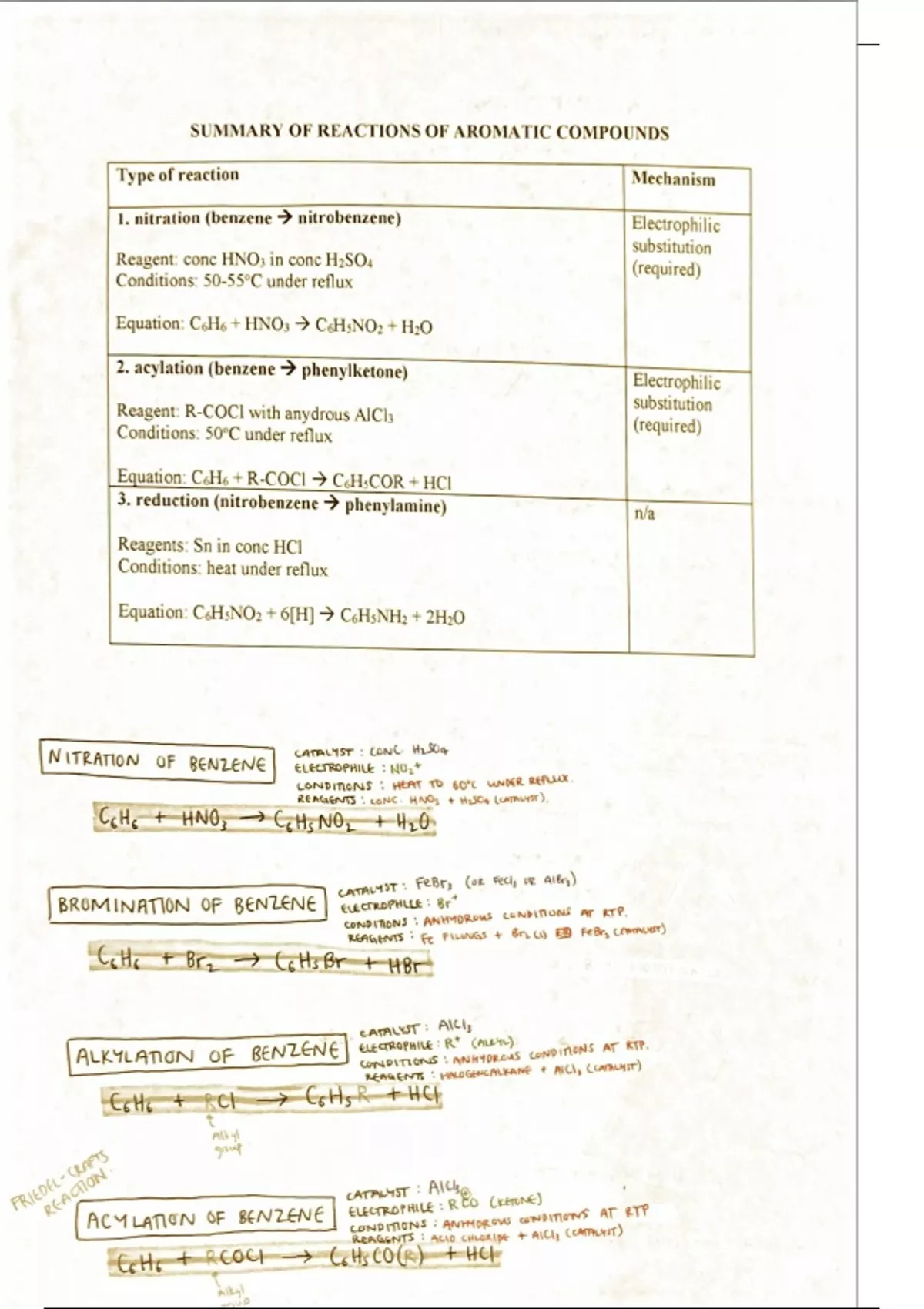 This document addresses specifically the Benzene and Phenol reactions/mechanisms. For Benzene, it provides outlines for each type of reaction and in turn, not only an identification of the corresponding mechanism but also a step-by-step guide to all mechanisms: Mechanism 1: Nitration Mechanism 2: Bromination Mechanism 3: Alkylations of Benzene (Friedel-Crafts reaction) Mechanism 4: Acylation of Benzene (Friedel-Crafts reaction) * Notes about the catalyst, electrophile, reagents, and conditions are included for each mechanism. The Phenol section outlines the mechanisms for four key reactions: Bromination, reaction with aqueous sodium hydroxide, reaction with acid chlorides, and Nitration, including brief notes on conditions, catalysts, observations, and reactions where relevant.