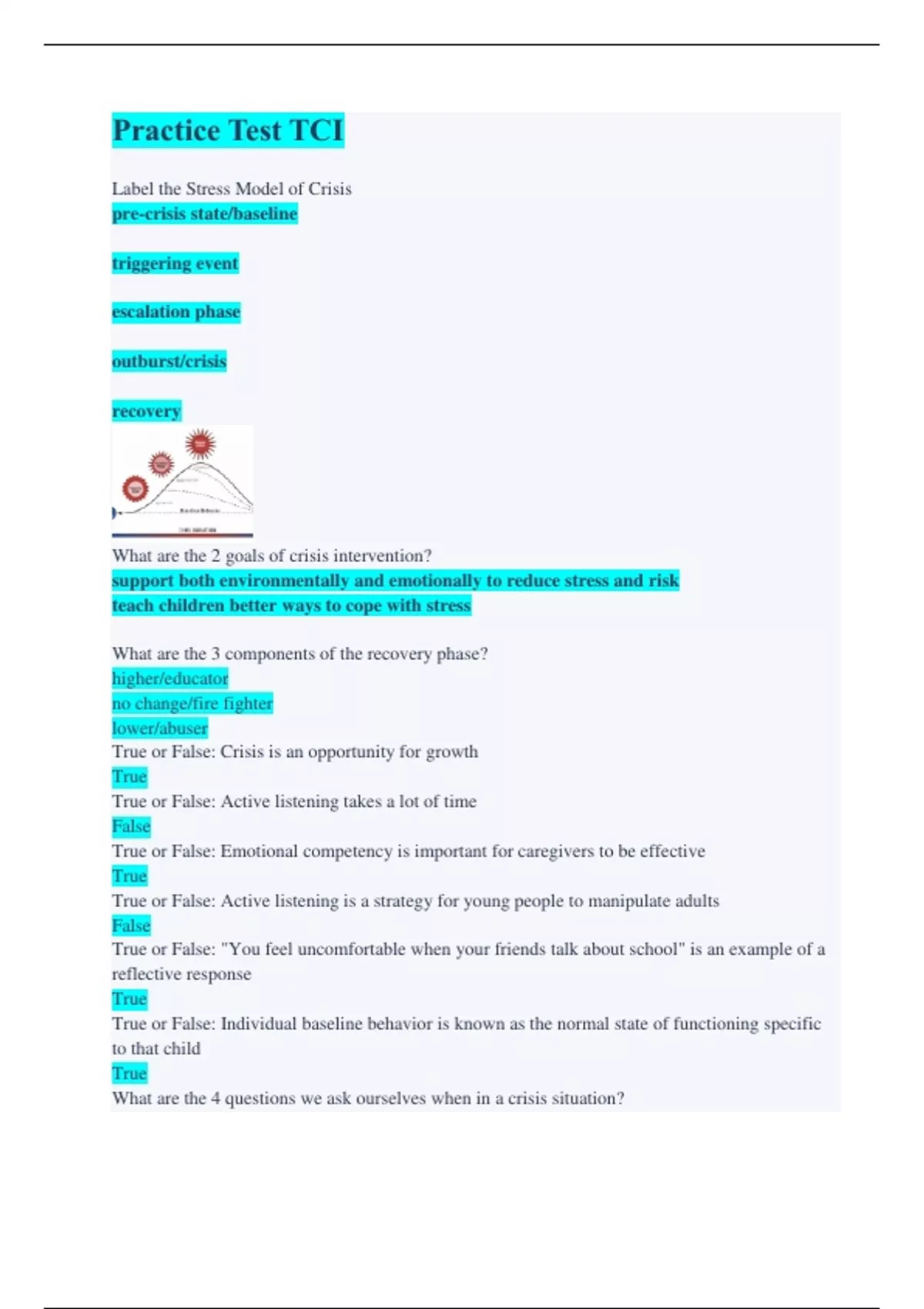 Practice Test TCI Label the Stress Model of Crisis pre-crisis state/baseline triggering event escalation phase outburst/crisis recovery What are the 2 goals of crisis intervention? support both environmentally and emotionally to reduce stress and risk teach children better ways to cope with stress What are the 3 components of the recovery phase? higher/educator no change/fire fighter lower/abuser True or False: Crisis is an opportunity for growth True True or False: Active listening takes a lot of time False True or False: Emotional competency is important for caregivers to be effective True True or False: Active listening is a strategy for young people to manipulate adults False True or False: "You feel uncomfortable when your friends talk about school" is an example of a reflective response True True or False: Individual baseline behavior is known as the normal state of functioning specific to that child True What are the 4 questions we ask ourselves when in a crisis situation
