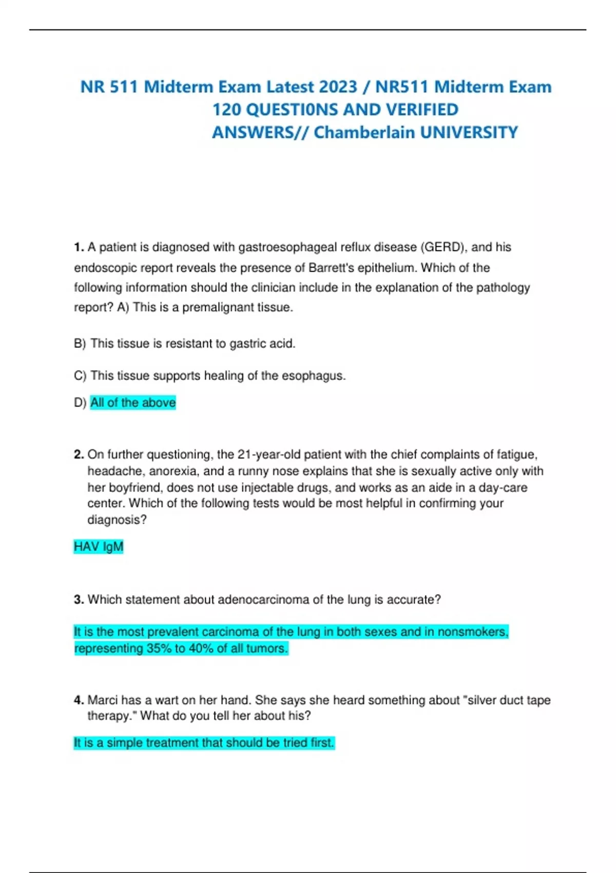 NR 511 Midterm Exam Latest 2023 / NR511 Midterm Exam 120 QUESTI0NS AND VERIFIED ANSWERS// Chamberlain UNIVERSITY 1. A patient is diagnosed with gastroesophageal reflux disease (GERD), and his endoscopic report reveals the presence of Barrett's epitheli