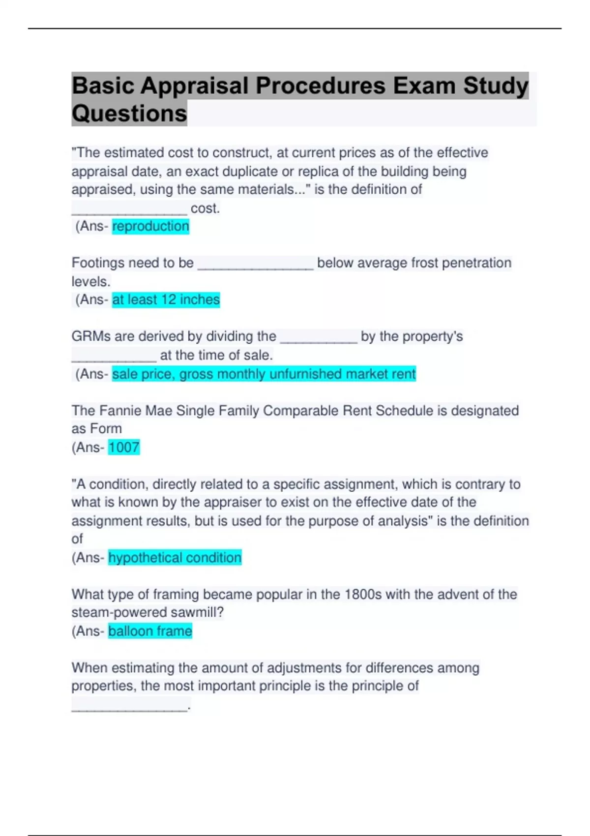 Basic Appraisal Procedures Exam :Study Questions & Answers: Updated Solution