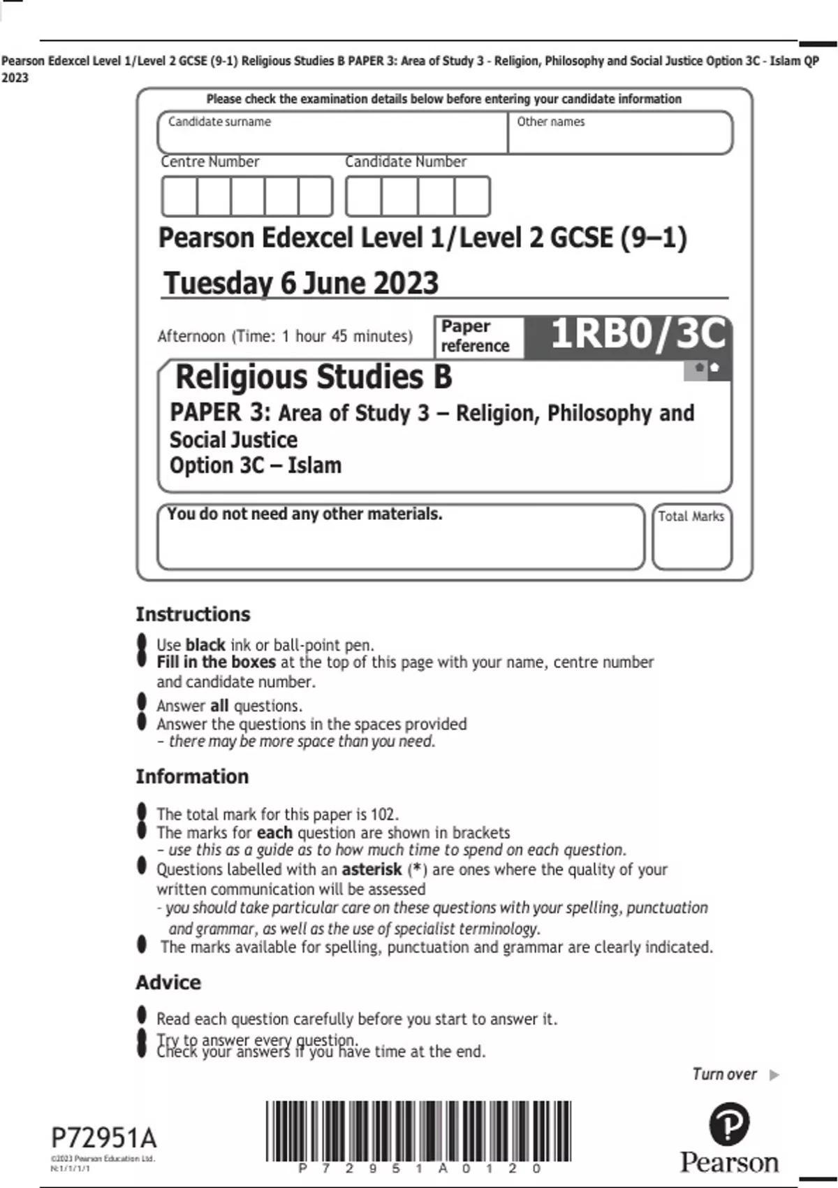 Pearson Edexcel Level 1/Level 2 GCSE (9–1) Religious Studies B PAPER 3: Area of Study 3 – Religion, Philosophy and Social Justice Option 3C – Islam QP