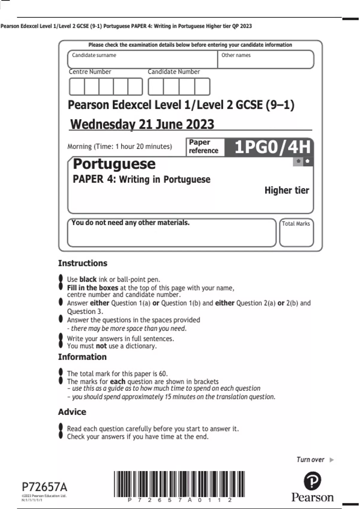 Pearson Edexcel Level 1/Level 2 GCSE (9–1) Portuguese PAPER 4: Writing in Portuguese Higher tier QP 2023