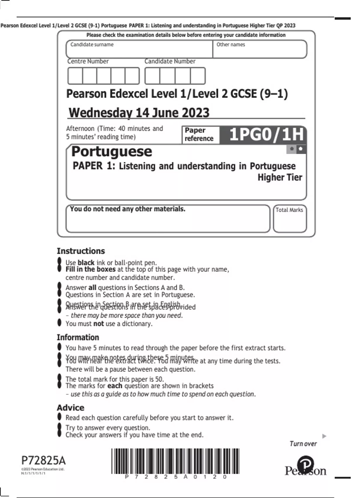 Pearson Edexcel Level 1/Level 2 GCSE (9–1) Portuguese PAPER 1: Listening and understanding in Portuguese Higher Tier QP 2023