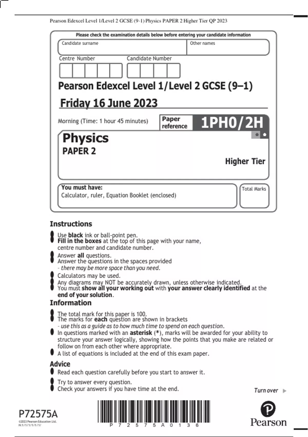 Pearson Edexcel Level 1/Level 2 GCSE (9–1) Physics PAPER 2 Higher Tier QP 2023
