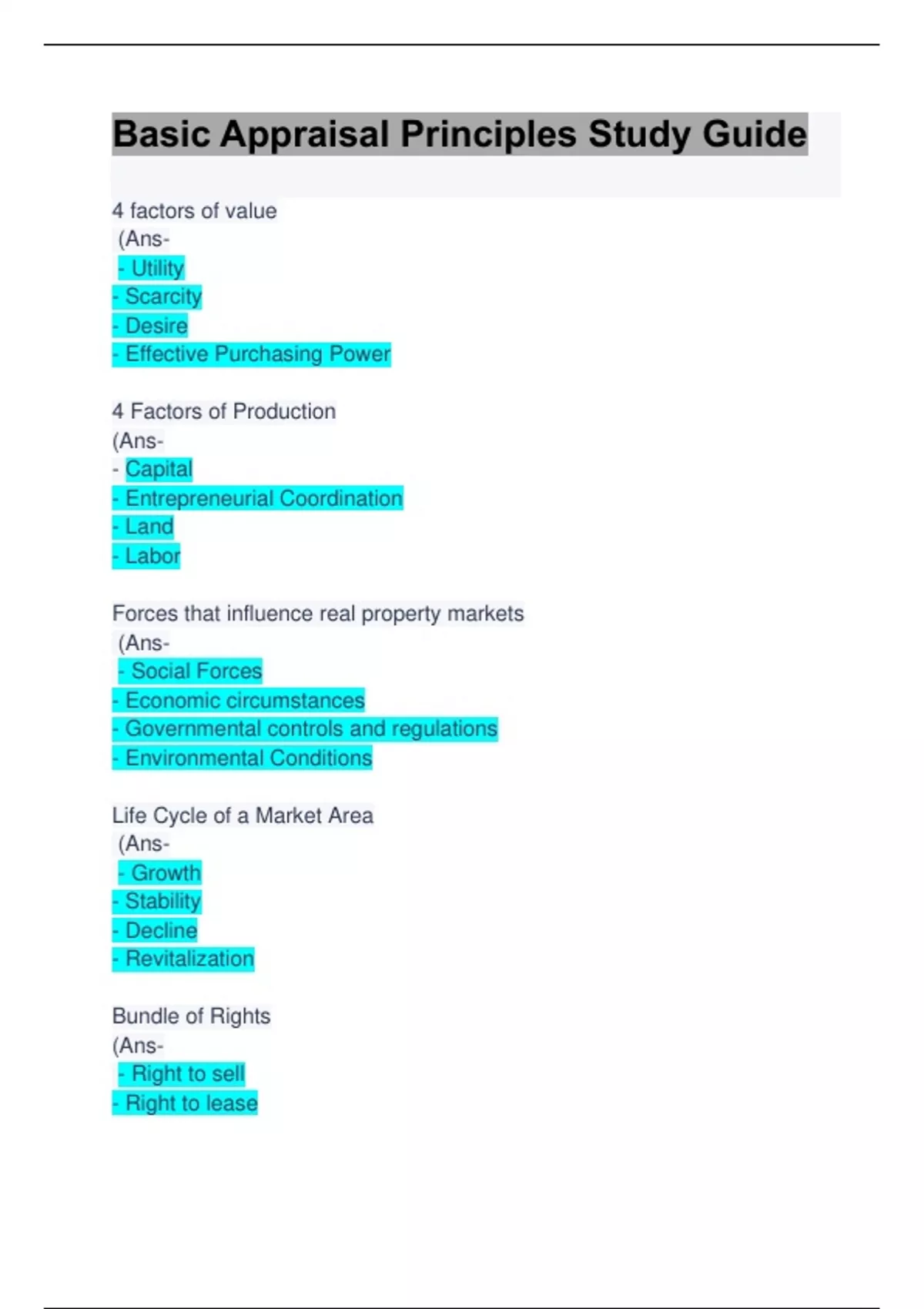 4 factors of value (Ans- - Utility - Scarcity - Desire - Effective Purchasing Power 4 Factors of Production (Ans- - Capital - Entrepreneurial Coordination - Land - Labor Forces that influence real property markets (Ans- - Social Forces - Economic circumstances - Governmental controls and regulations - Environmental Conditions Life Cycle of a Market Area (Ans- - Growth - Stability - Decline - Revitalization Bundle of Rights (Ans- - Right to sell - Right to lease - Right to occupy - Right to mortgage - Right to give it away 4 Powers of Government (Ans- - Police Power - Eminent domain - Taxation - Escheat 4 Forms of Ownership (Ans- - Community Property - Joint Tenancy - Tenancy by the entirety - Tenancy in common community property (Ans- System of ownership; each spouse has an equal interest in property acquired during marriage: separate property is that acquired before marriage USPAP (Ans- current standards of the appraisal profession Utility (Ans- the ability of a product to satisfy a human want, need or desire. scarcity