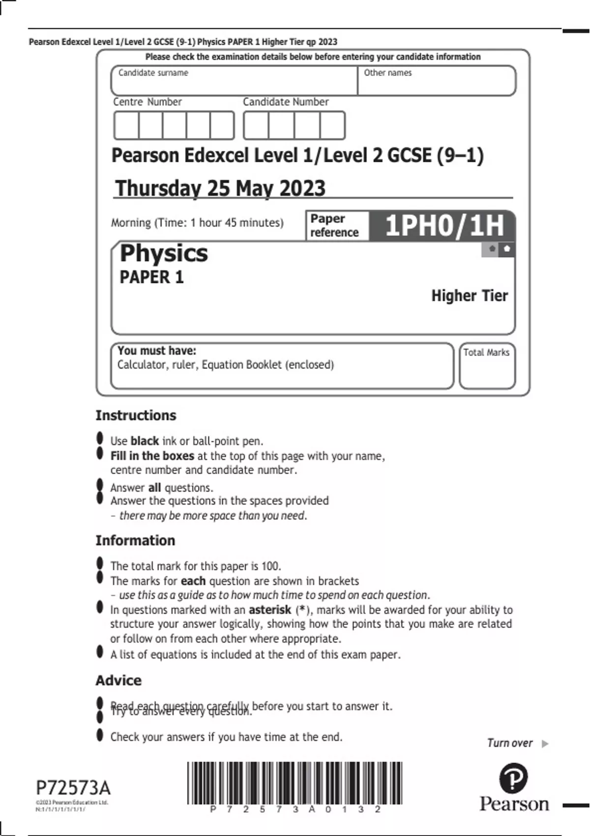 Pearson Edexcel Level 1/Level 2 GCSE (9–1) Physics PAPER 1 Higher Tier qp 2023