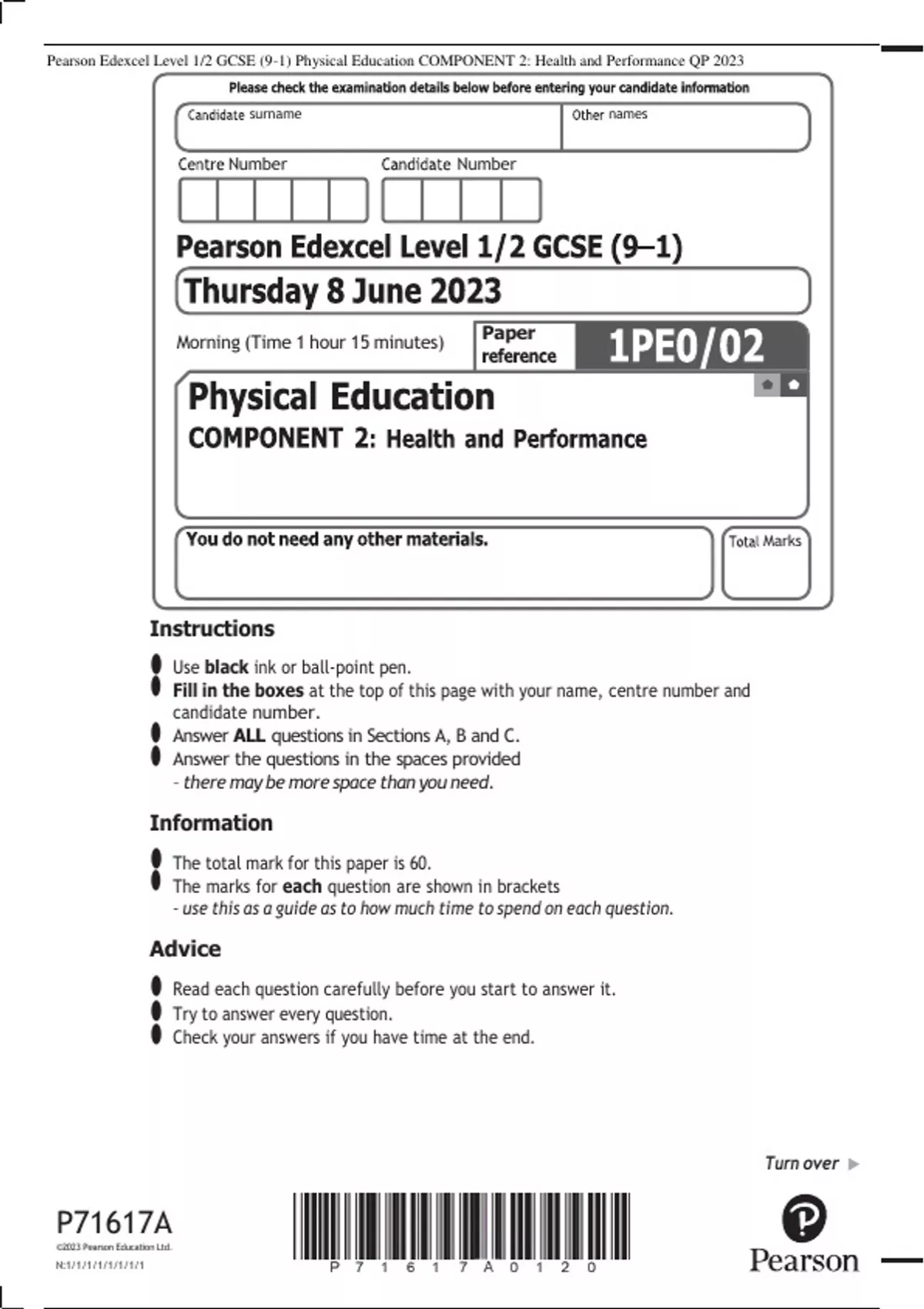 Pearson Edexcel Level 1/2 GCSE (9–1) Physical Education COMPONENT 2: Health and Performance QP 2023