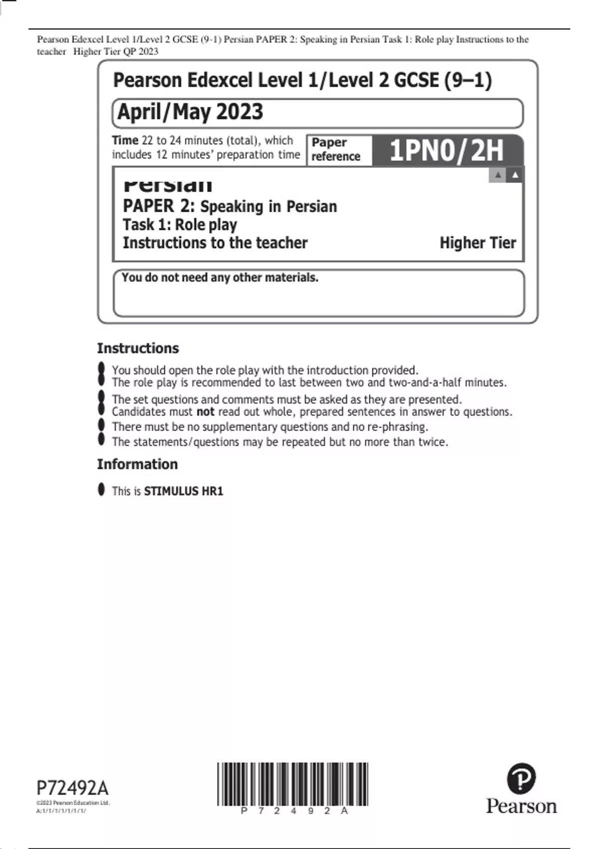 Pearson Edexcel Level 1/Level 2 GCSE (9–1) Persian PAPER 2: Speaking in Persian Task 1: Role play Instructions to the