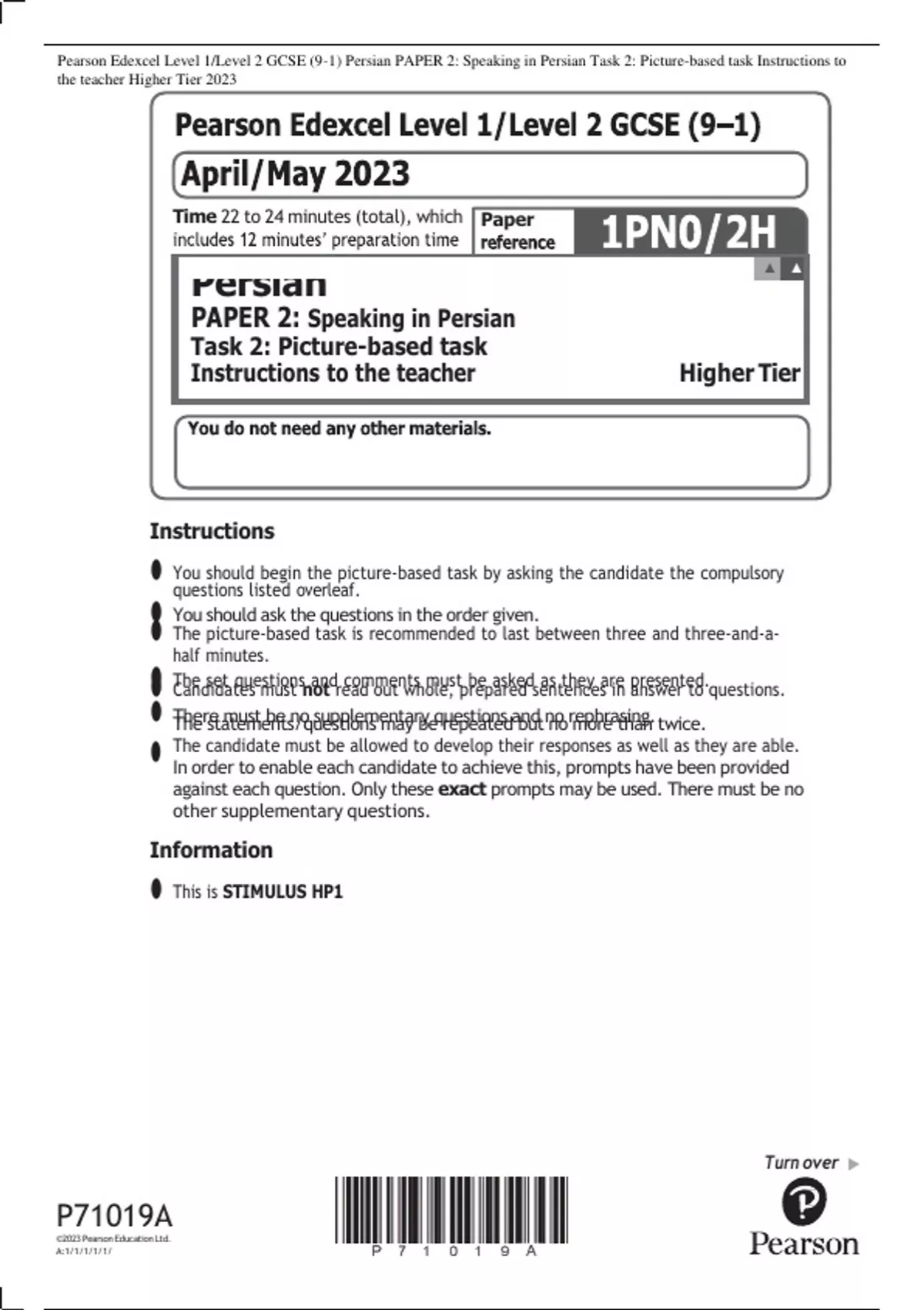 Pearson Edexcel Level 1/Level 2 GCSE (9–1) Persian PAPER 2: Speaking in Persian Task 2: Picture-based task Instructions to the teacher Higher Tier 2023