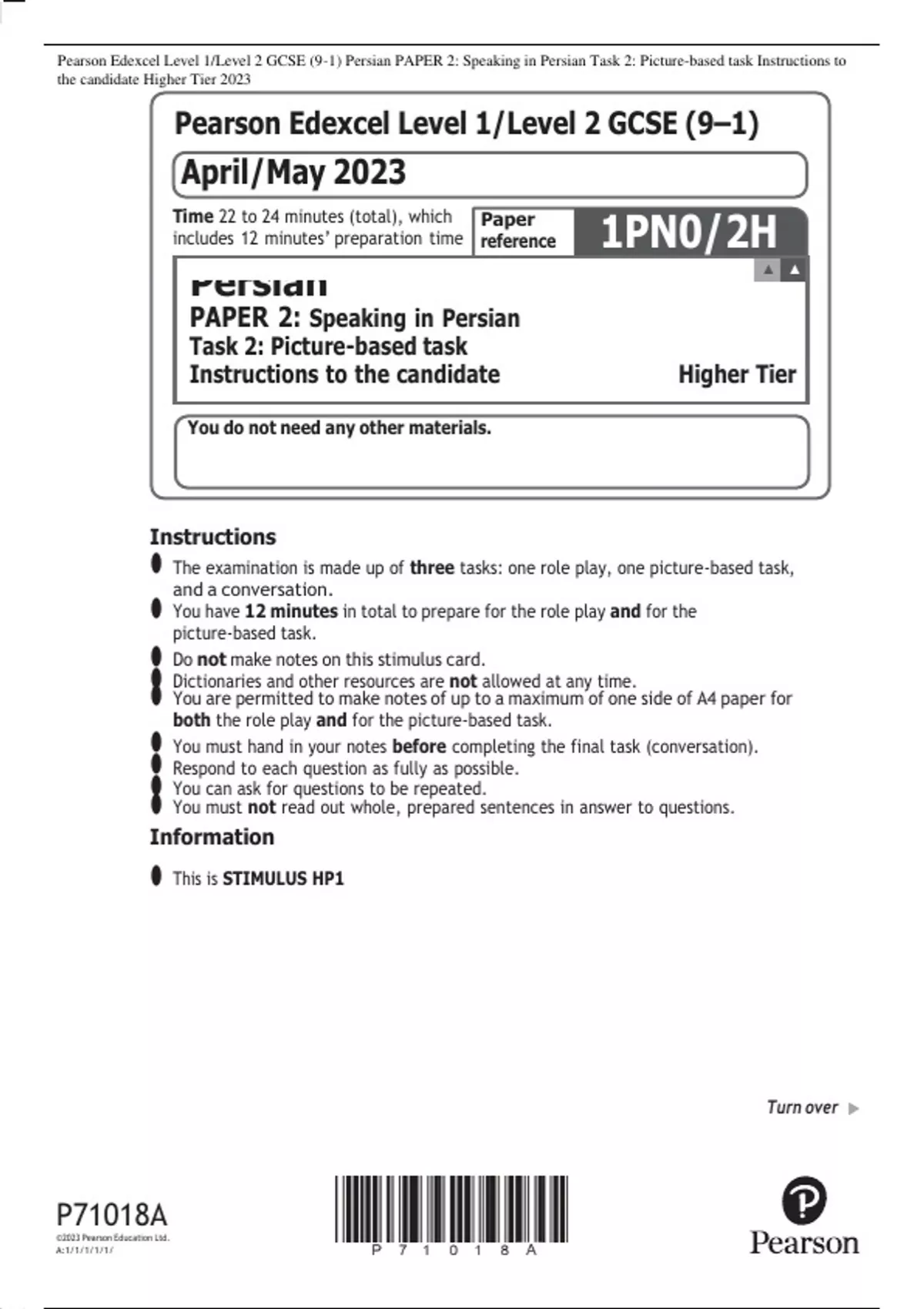 Pearson Edexcel Level 1/Level 2 GCSE (9–1) Persian PAPER 2: Speaking in Persian Task 2: Picture-based task Instructions to the candidate Higher Tier 2023