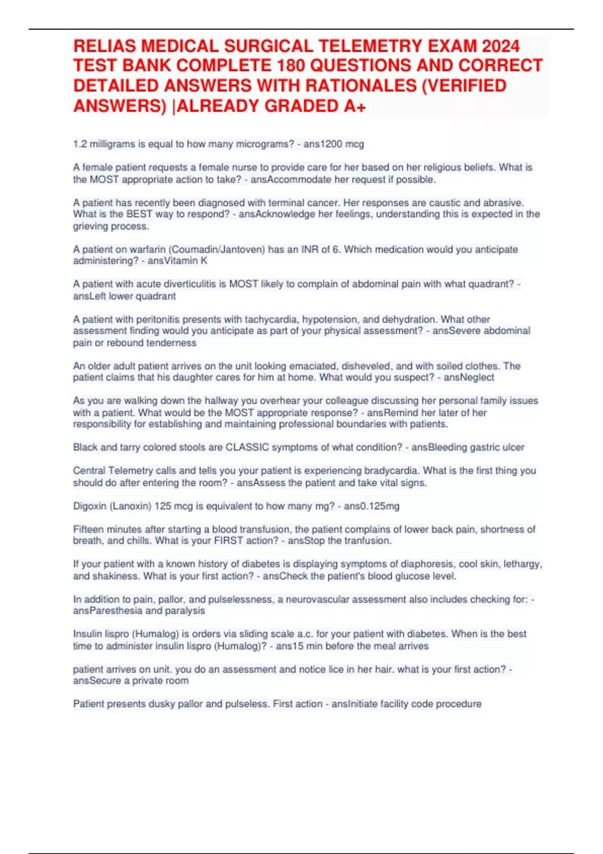 RELIAS MEDICAL SURGICAL TELEMETRY EXAM 2024 TEST BANK COMPLETE 180 QUESTIONS AND CORRECT DETAILED ANSWERS WITH RATIONALES (VERIFIED ANSWERS) |ALREADY GRADED A+