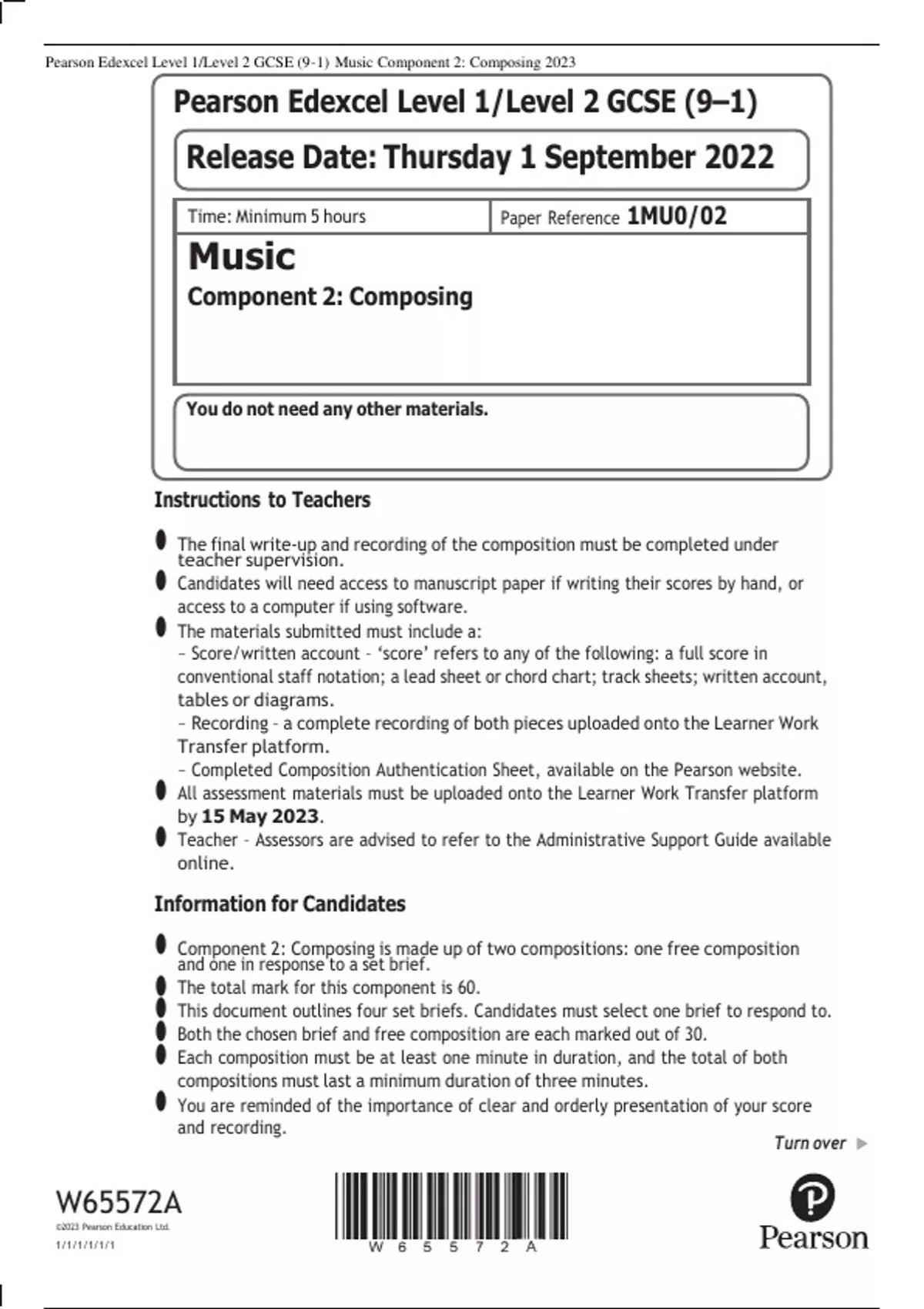 Pearson Edexcel Level 1/Level 2 GCSE (9–1) Music Component 2: Composing 2023