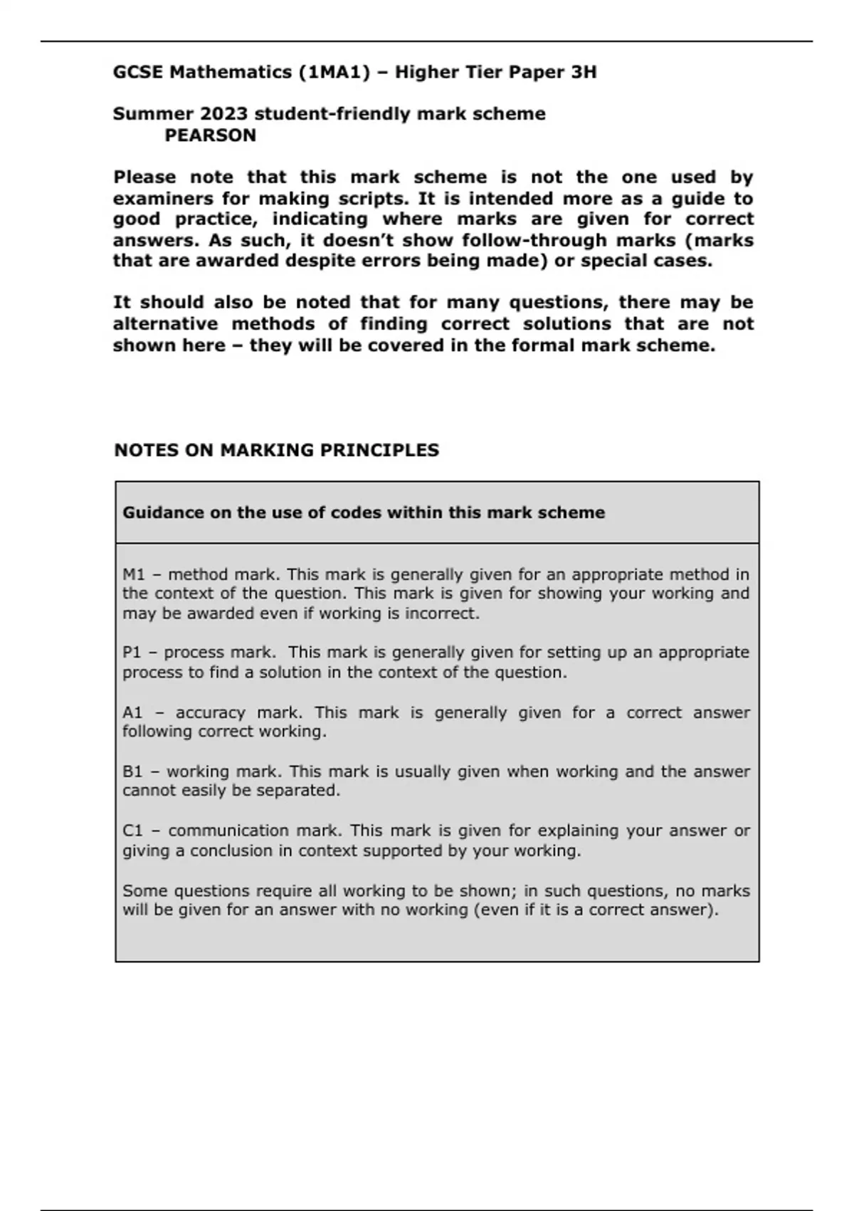GCSE Mathematics (1MA1) – Higher Tier Paper 3H Summer 2023 student-friendly mark scheme PEARSON