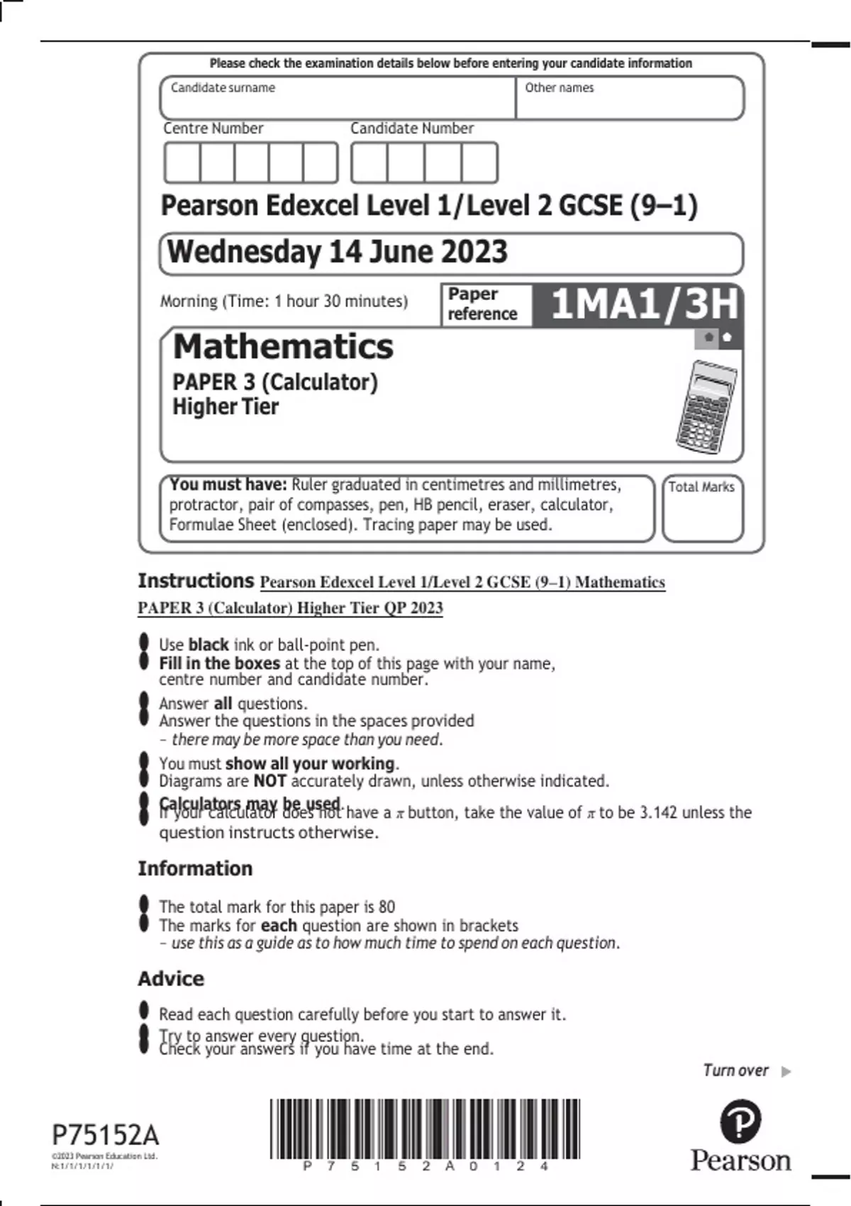 Instructions Pearson Edexcel Level 1/Level 2 GCSE (9–1) Mathematics