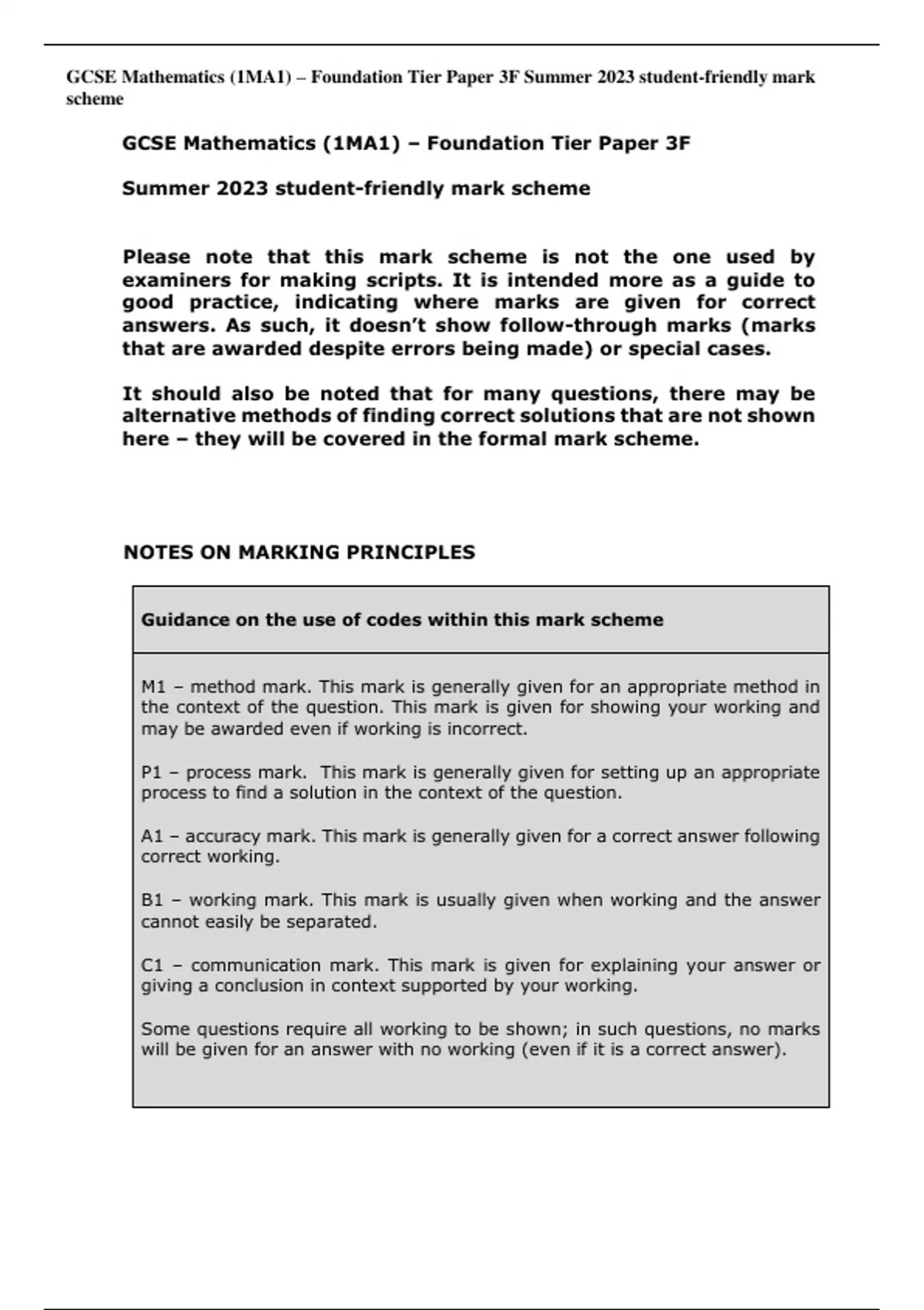 GCSE Mathematics (1MA1) – Foundation Tier Paper 3F Summer 2023 student-friendly mark scheme