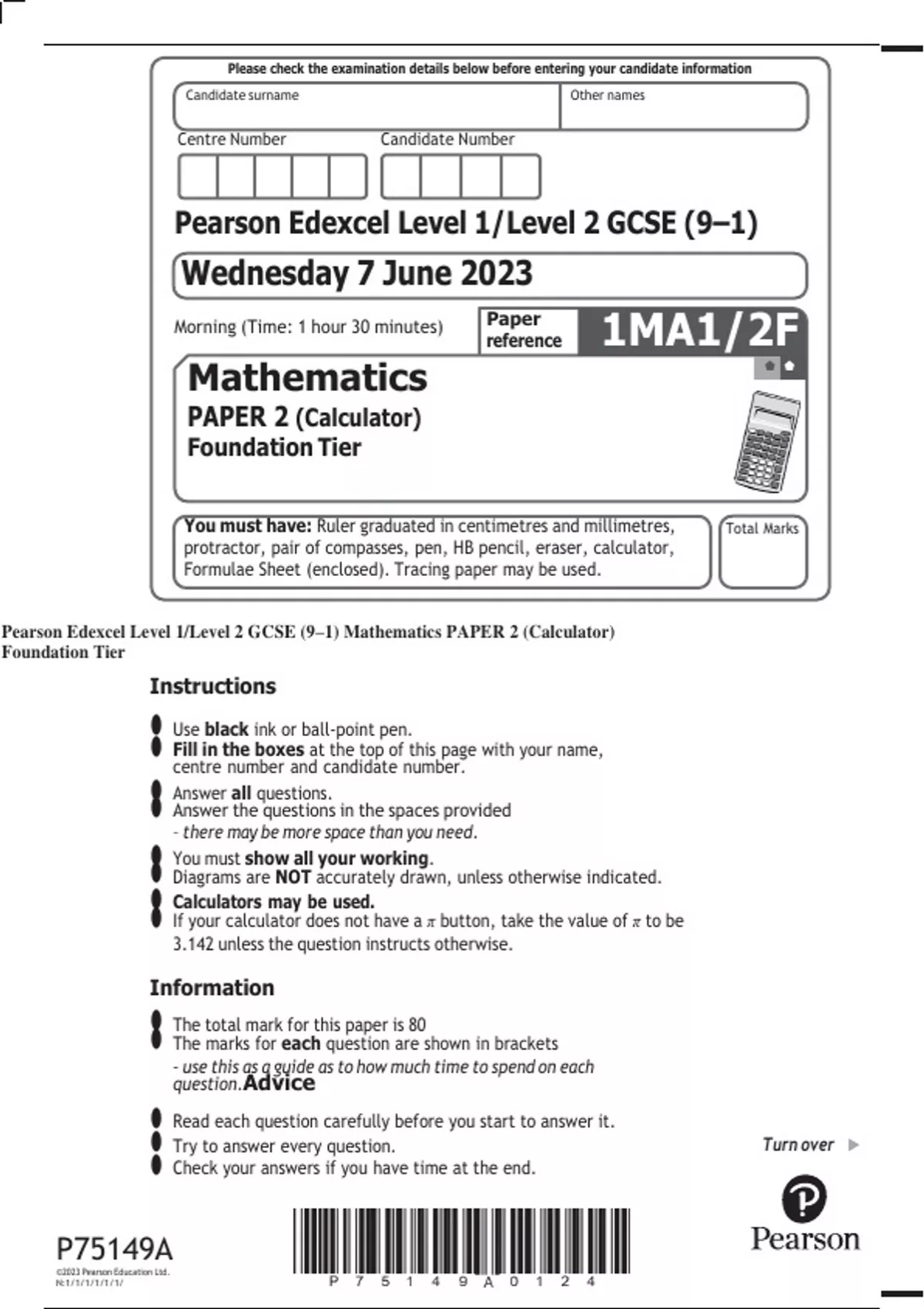 Pearson Edexcel Level 1/Level 2 GCSE (9–1) Mathematics PAPER 2 (Calculator)