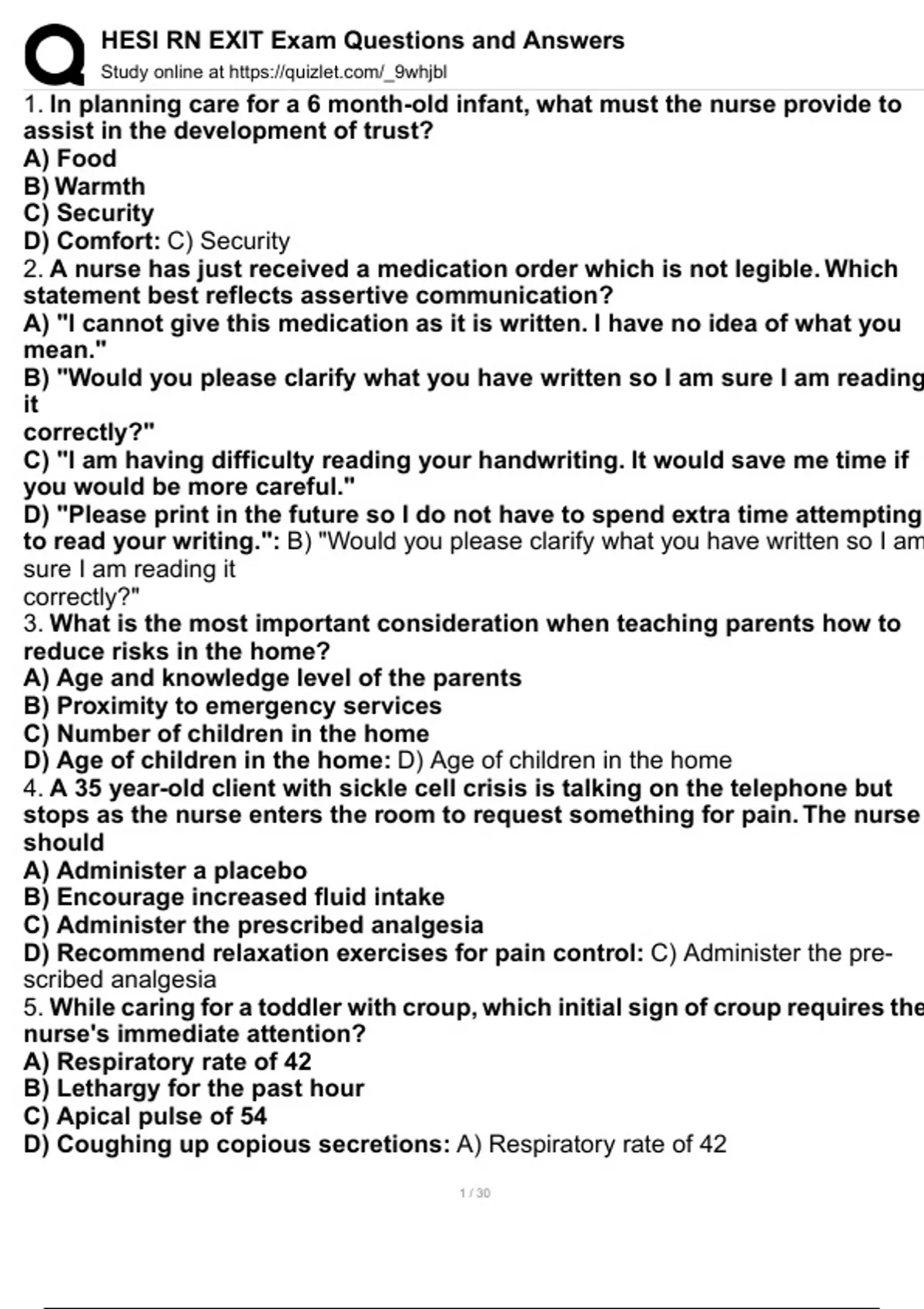 HESI RN EXIT Exam Questions and Answers . 1. In planning care for a 6 month-old infant, what must the nurse provide to assist in the development of trust? A) Food B) Warmth C) Security D) Comfort: C) Security