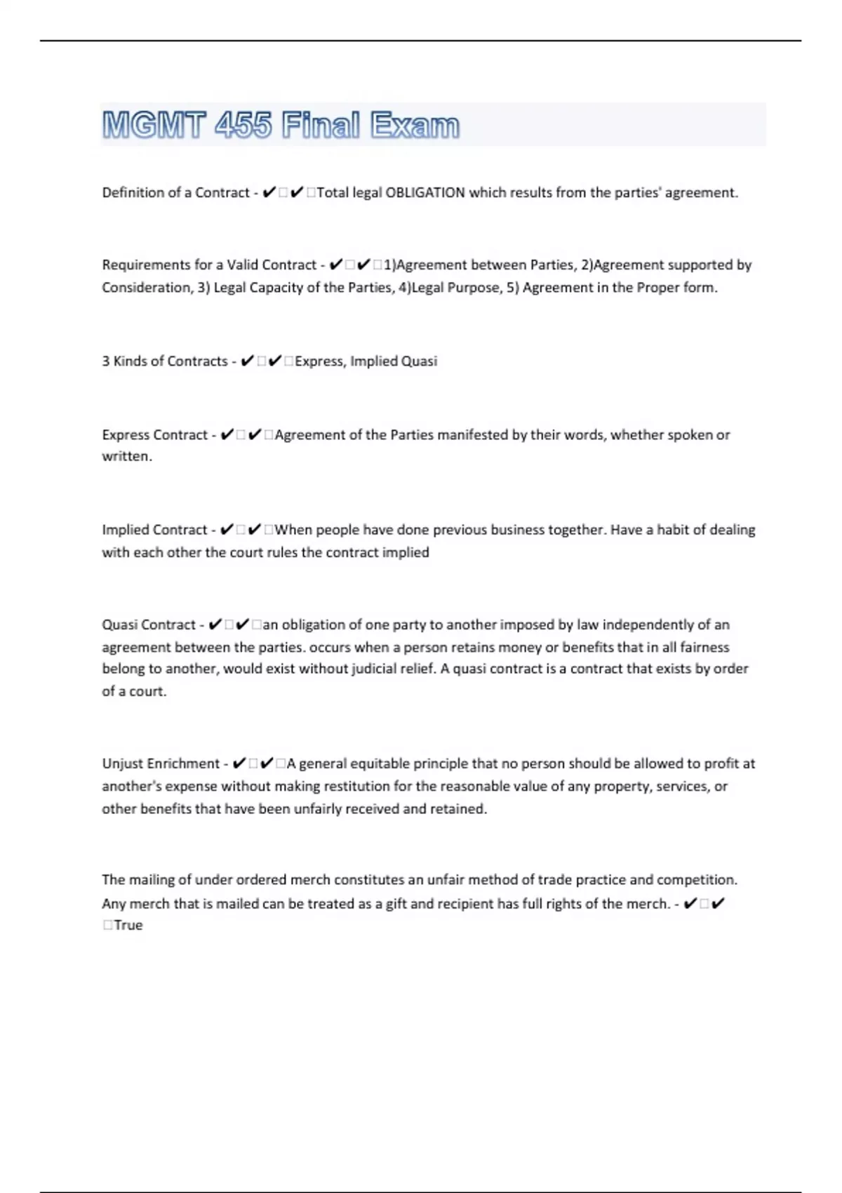 Definition of a Contract - ️️Total legal OBLIGATION which results from the parties' agreement. Requirements for a Valid Contract - ️️1)Agreement between Parties, 2)Agreement supported by Consideration, 3) Legal Capacity of the Parties, 4)Legal Purpose, 5) Agreement in the Proper form. 3 Kinds of Contracts - ️️Express, Implied Quasi Express Contract - ️️Agreement of the Parties manifested by their words, whether spoken or written. Implied Contract - ️️When people have done previous business together. Have a habit of dealing with each other the court rules the contract implied Quasi Contract - ️️an obligation of one party to another imposed by law independently of an agreement between the parties. occurs when a person retains money or benefits that in all fairness belong to another, would exist without judicial relief. A quasi contract is a contract that exists by order of a court. Unjust Enrichment - ️️A general equitable principle that no person should be allowed to profit at another's expense without making restitution for the reasonable value of any property, services, or other benefits that have been unfairly received and retained. The mailing of under ordered merch constitutes an unfair method of trade practice and competition. Any merch that is mailed can be treated as a gift and recipient has full rights of the merch. - ️️True