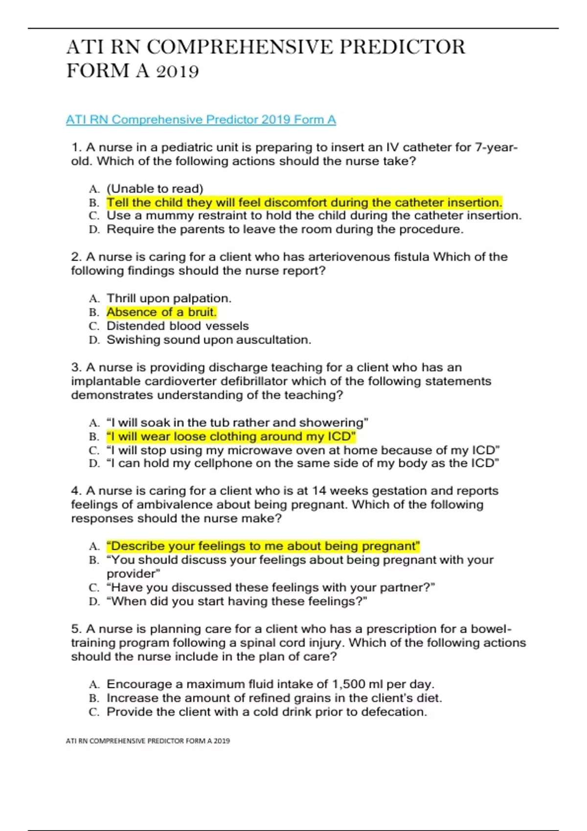 1. A nurse in a pediatric unit is preparing to insert an IV catheter for 7-year- old. Which of the following actions should the nurse take? A. (Unable to read) B. Tell the child they will feel discomfort during the catheter insertion. C. Use a mummy restraint to hold the child during the catheter insertion. D. Require the parents to leave the room during the procedure. 2. A nurse is caring for a client who has arteriovenous fistula Which of the following findings