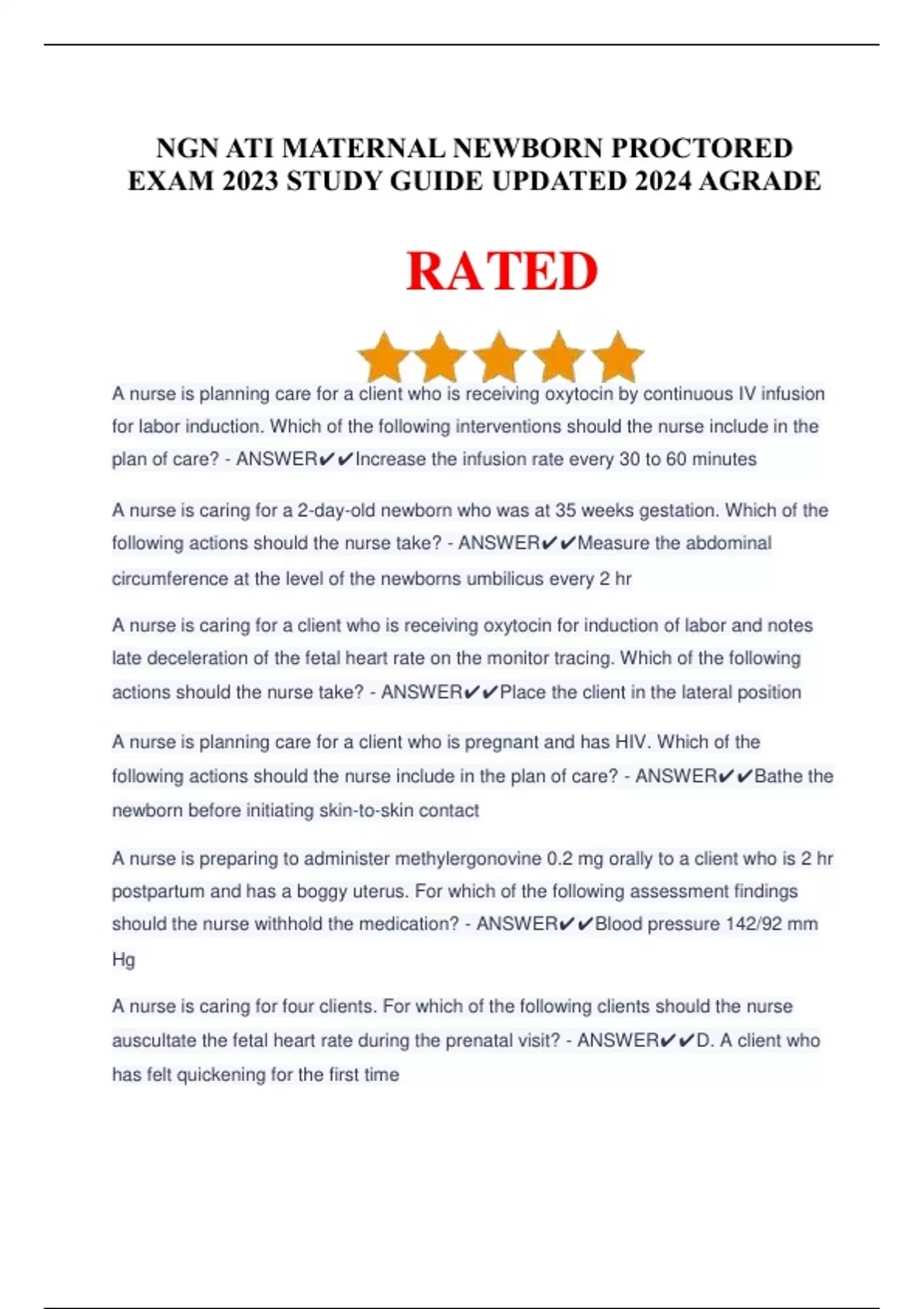 NGN ATI MATERNAL NEWBORN PROCTORED EXAM 2023 STUDY GUIDE UPDATED 2024 AGRADE