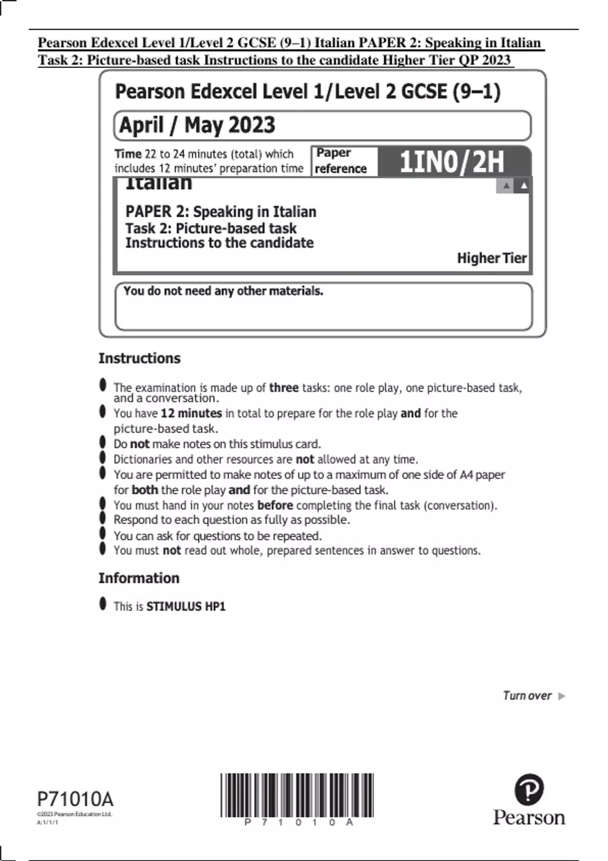 Pearson Edexcel Level 1/Level 2 GCSE (9–1) Italian PAPER 2: Speaking in Italian