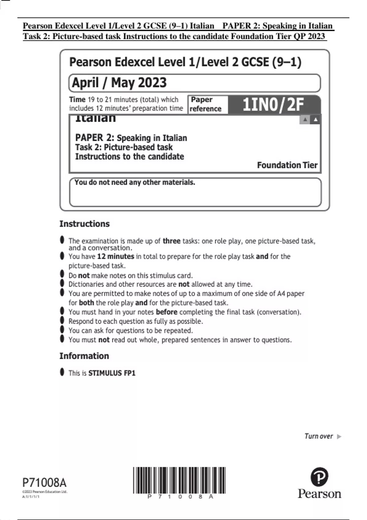 Pearson Edexcel Level 1/Level 2 GCSE (9–1) Italian PAPER 2: Speaking in Italian