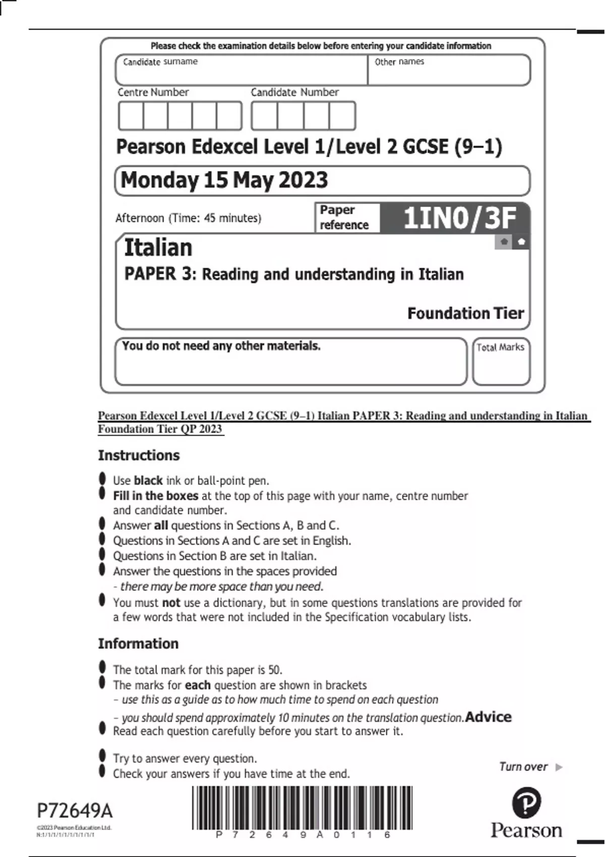 Pearson Edexcel Level 1/Level 2 GCSE (9–1) Italian PAPER 3: Reading and understanding in Italian
