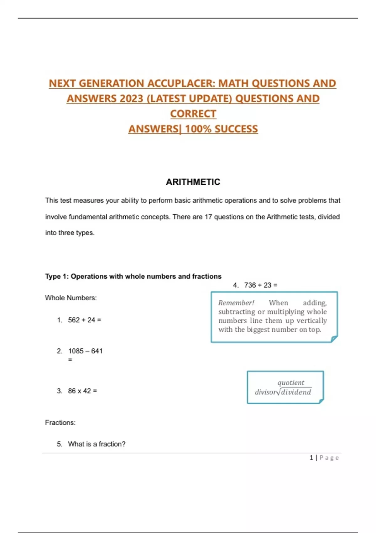 NEXT GENERATION ACCUPLACER: MATH QUESTIONS AND ANSWERS 2023 (LATEST UPDATE) QUESTIONS AND CORRECT ANSWERS| 100% SUCCESS
