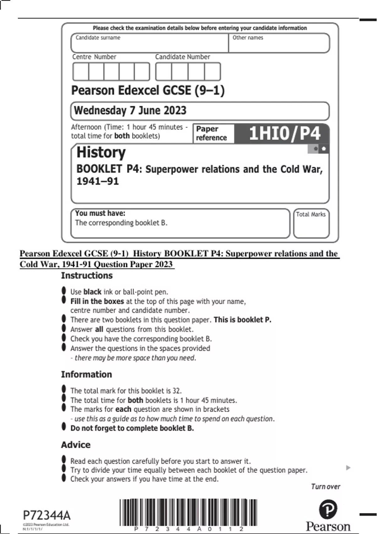 Pearson Edexcel GCSE (9–1) History BOOKLET P4: Superpower relations and the Cold War, 1941–91 Question Paper 2023