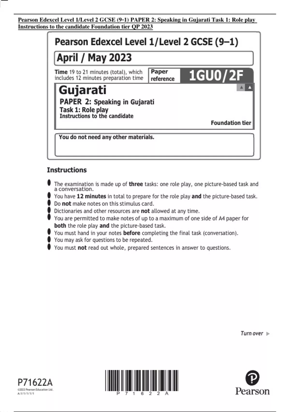 Pearson Edexcel Level 1/Level 2 GCSE (9–1) PAPER 2: Speaking in Gujarati Task 1: Role play