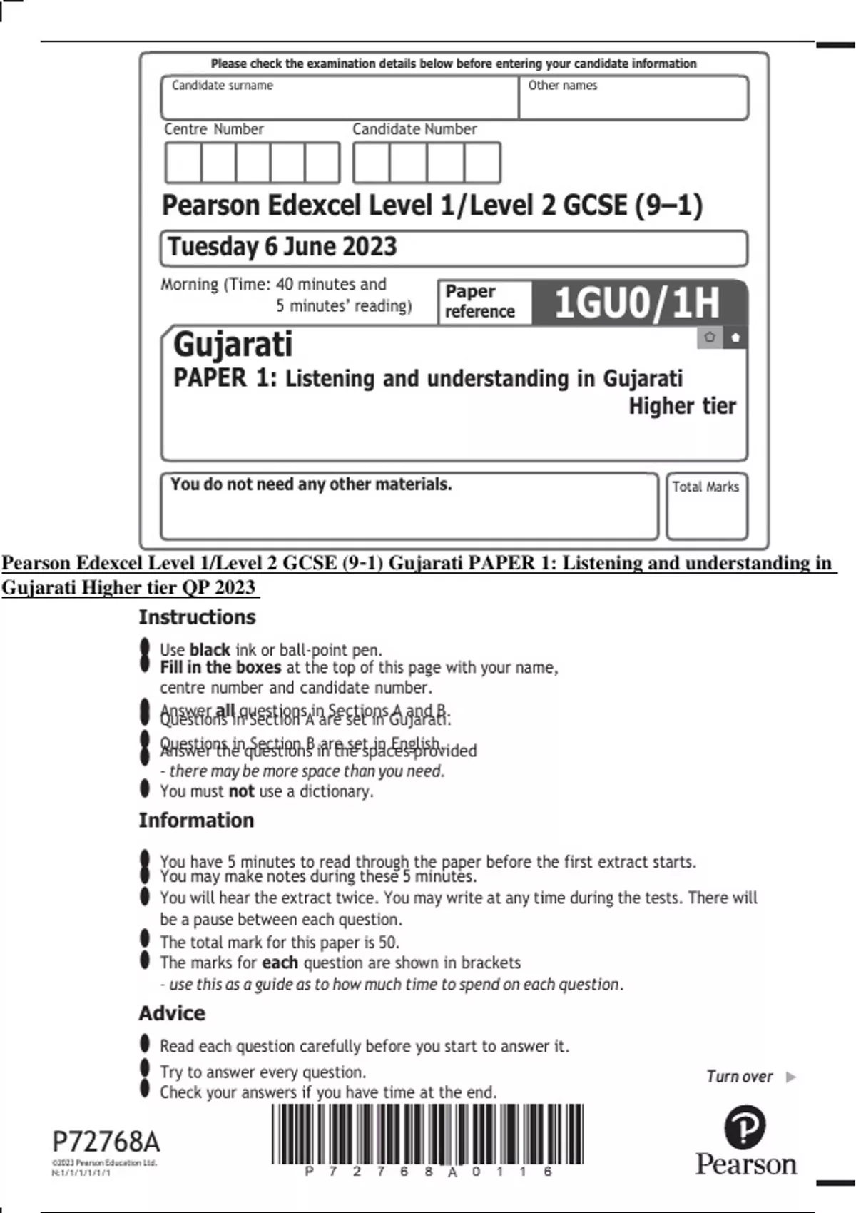 Pearson Edexcel Level 1/Level 2 GCSE (9–1) Gujarati PAPER 1: Listening and understanding in Gujarati Higher tier QP 2023