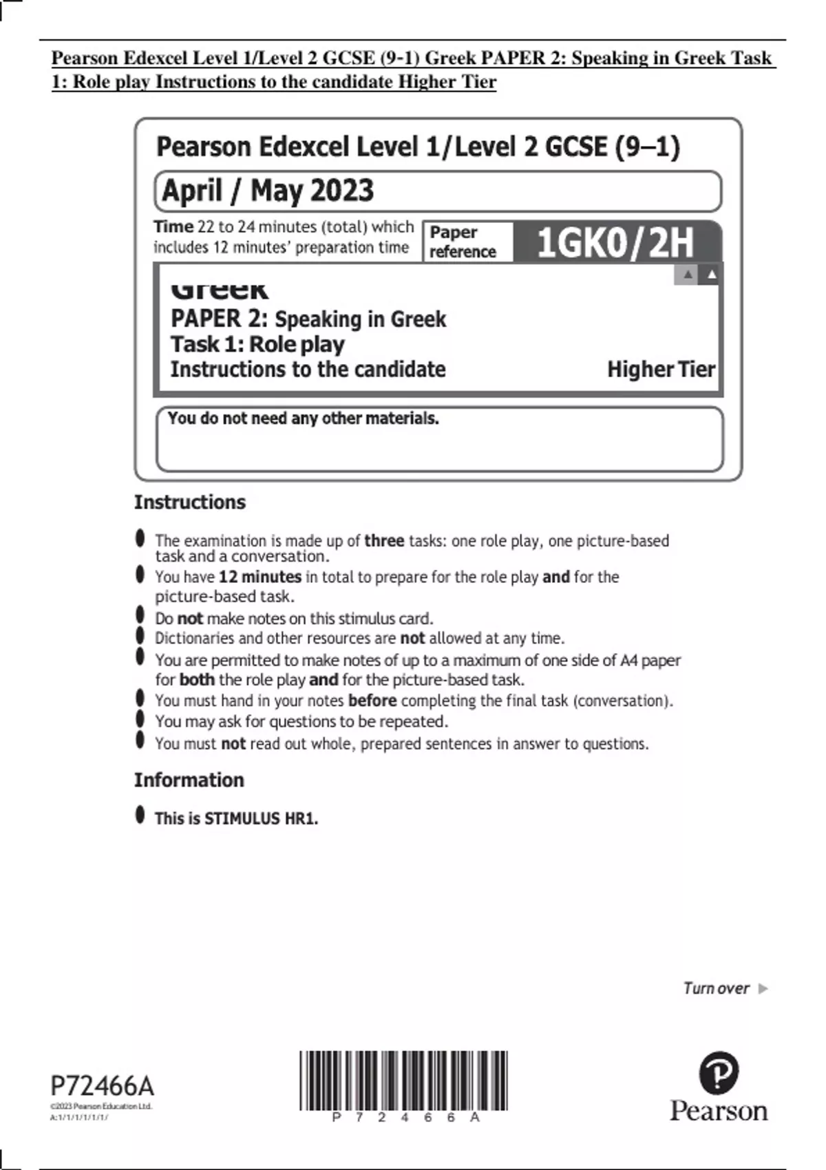 Pearson Edexcel Level 1/Level 2 GCSE (9–1) Greek PAPER 2: Speaking in Greek Task 1: Role play Instructions to the candidate Higher Tier