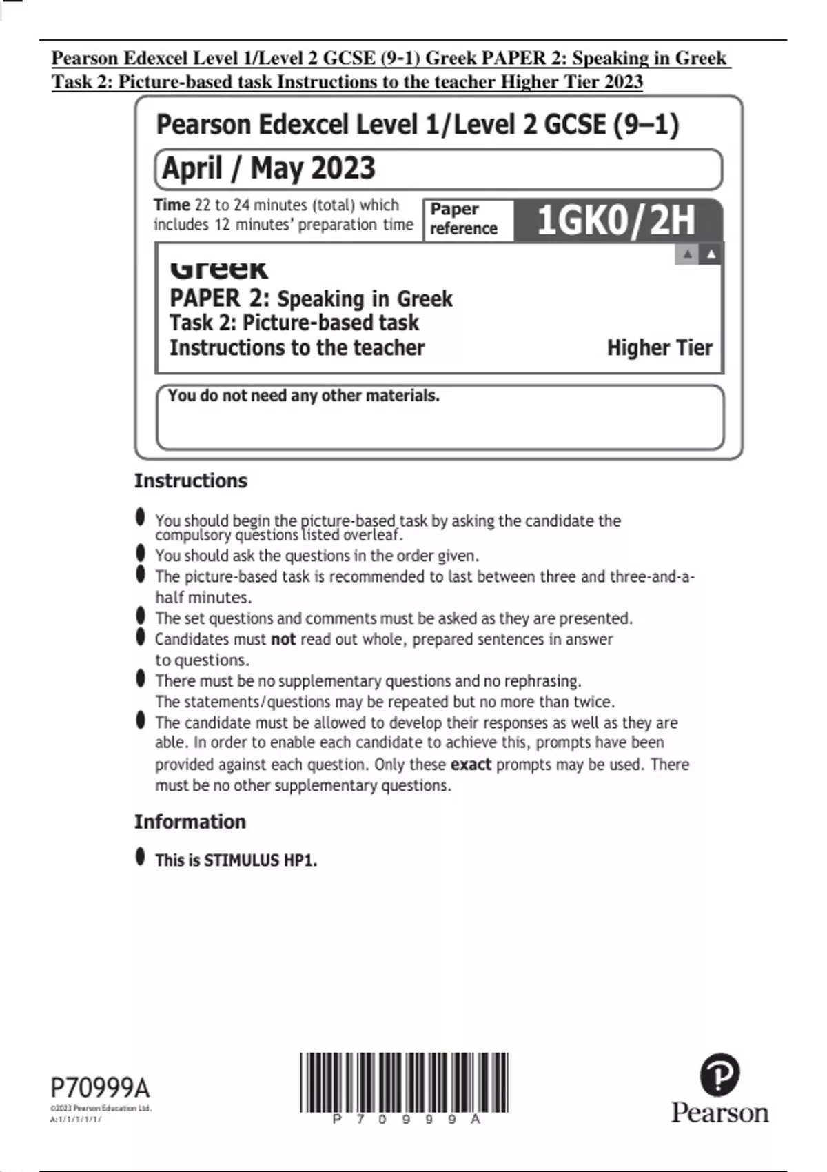 Pearson Edexcel Level 1/Level 2 GCSE (9–1) Greek PAPER 2: Speaking in Greek