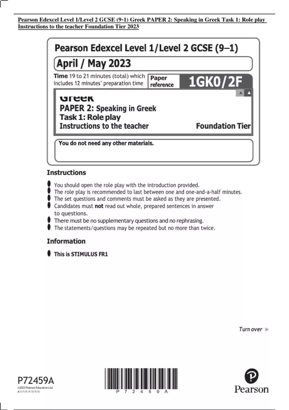 Pearson Edexcel Level 1/Level 2 GCSE (9–1) Greek PAPER 2: Speaking in Greek Task 1: Role play