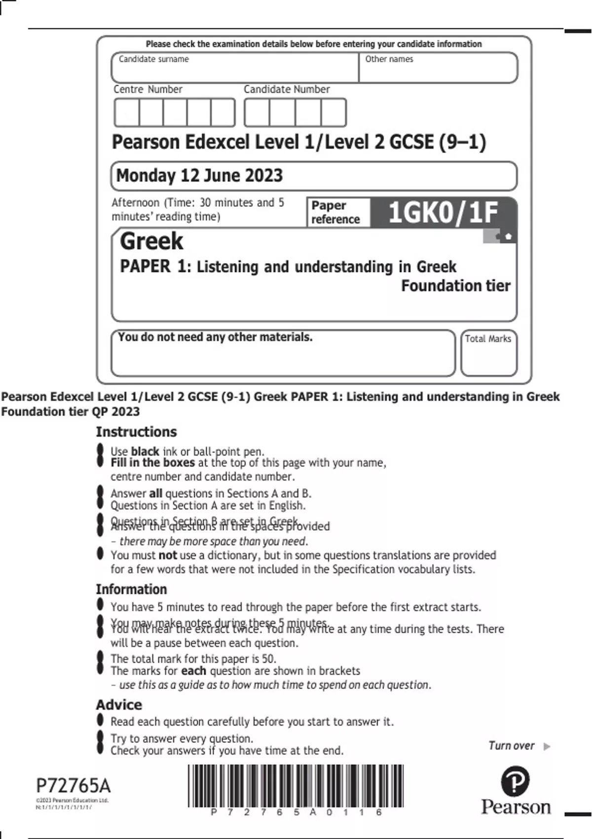 Pearson Edexcel Level 1/Level 2 GCSE (9–1) Greek PAPER 1: Listening and understanding in Greek Foundation tier QP 2023