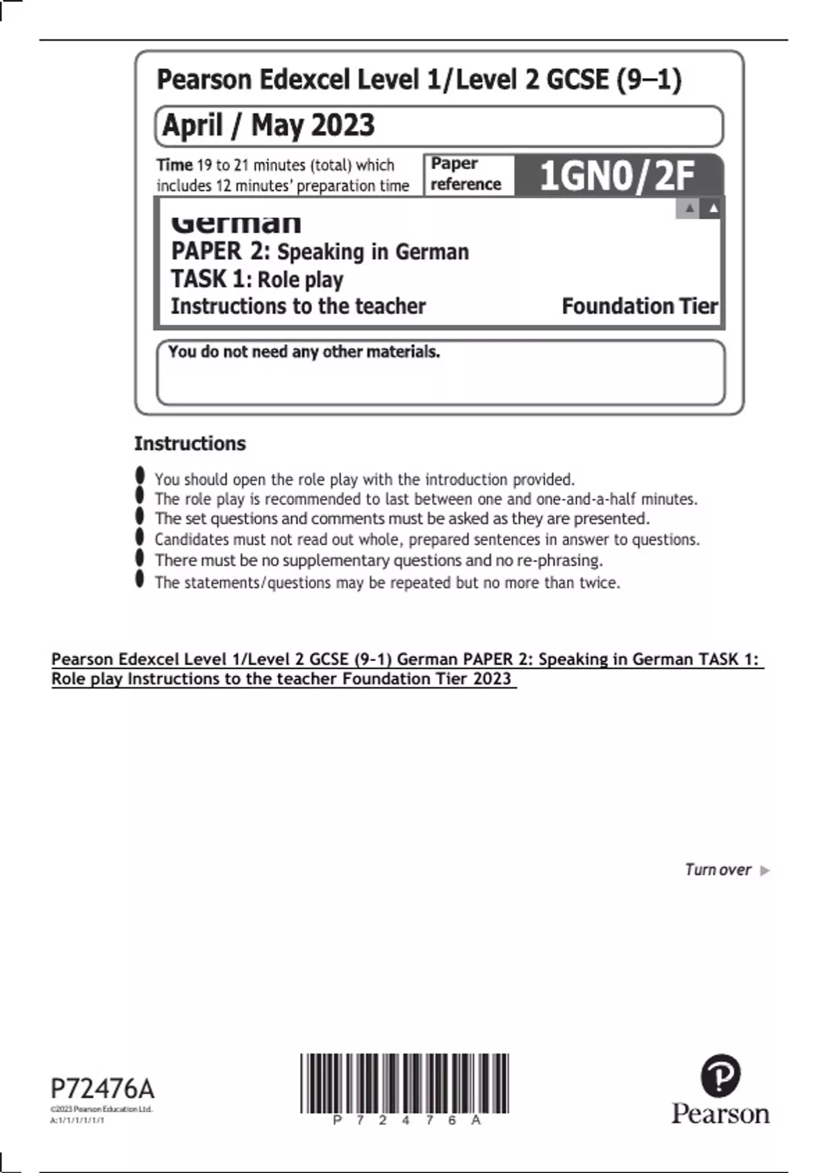 Pearson Edexcel Level 1/Level 2 GCSE (9–1) German PAPER 2: Speaking in German TASK 1: